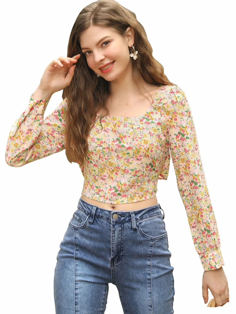 Allegra K Women’s Tie Back Peasant Square Neck Floral Prairie Cropped Tops