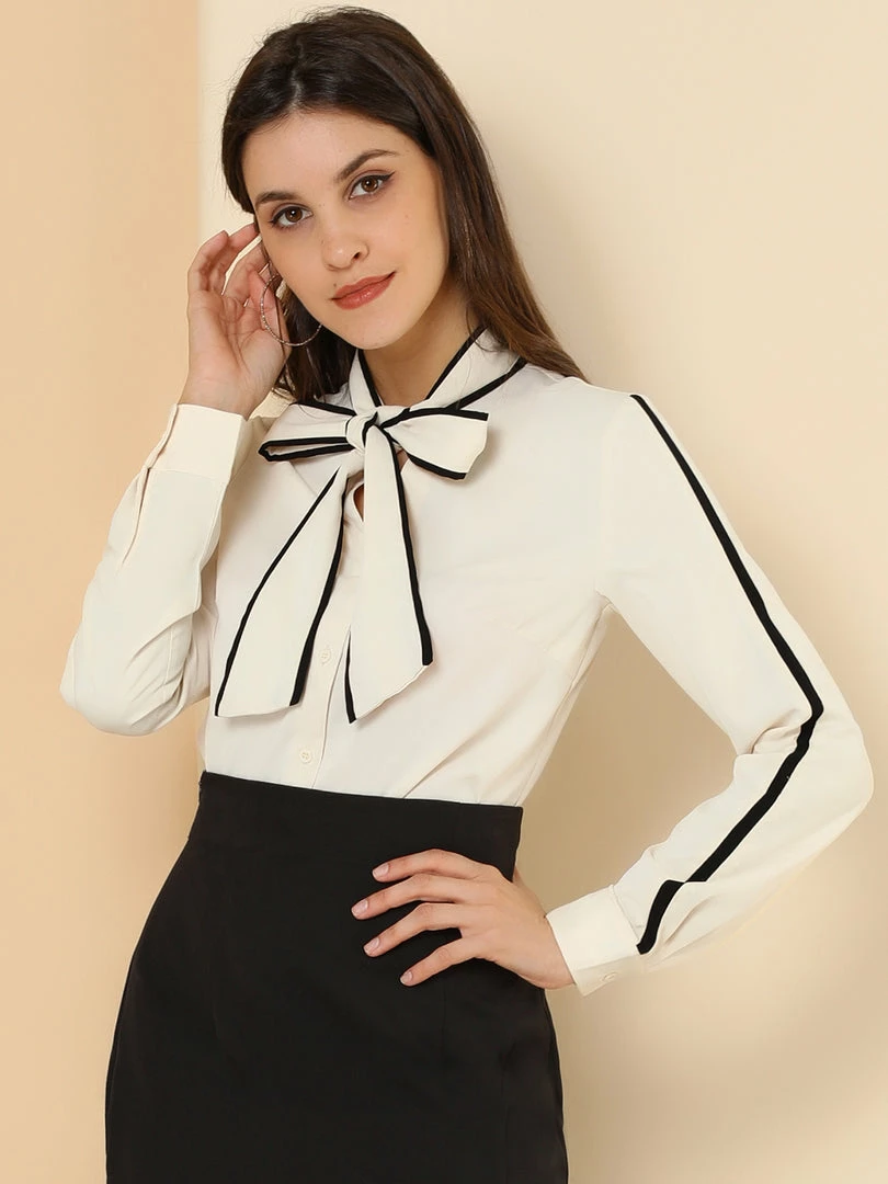 Allegra K Women’s Tie Bow Neck Contrast Trim Long Sleeve Office Blouse Top