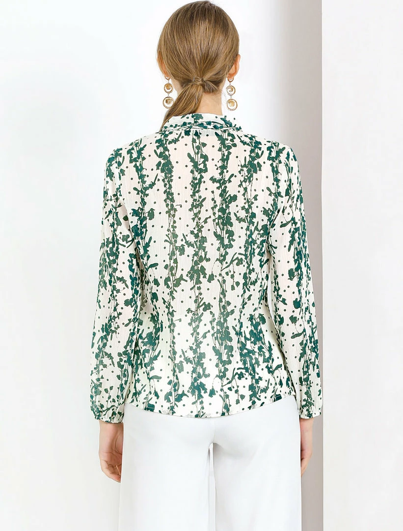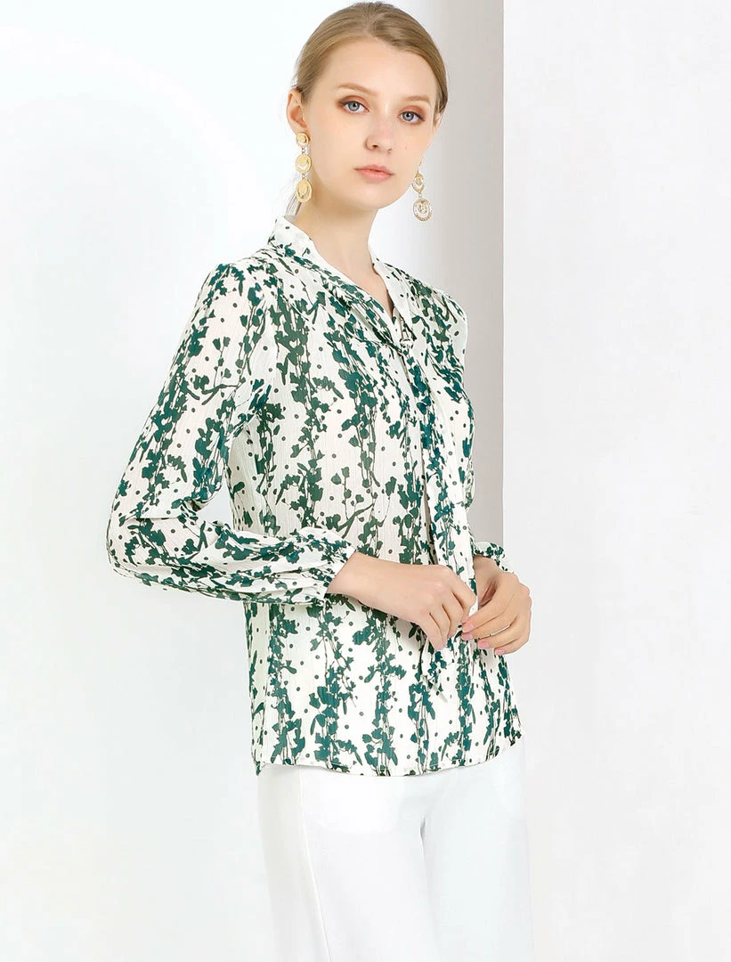 Allegra K Women’s Tie Neck Floral Printed Bishop Sleeve Elegant Work Top Blouse