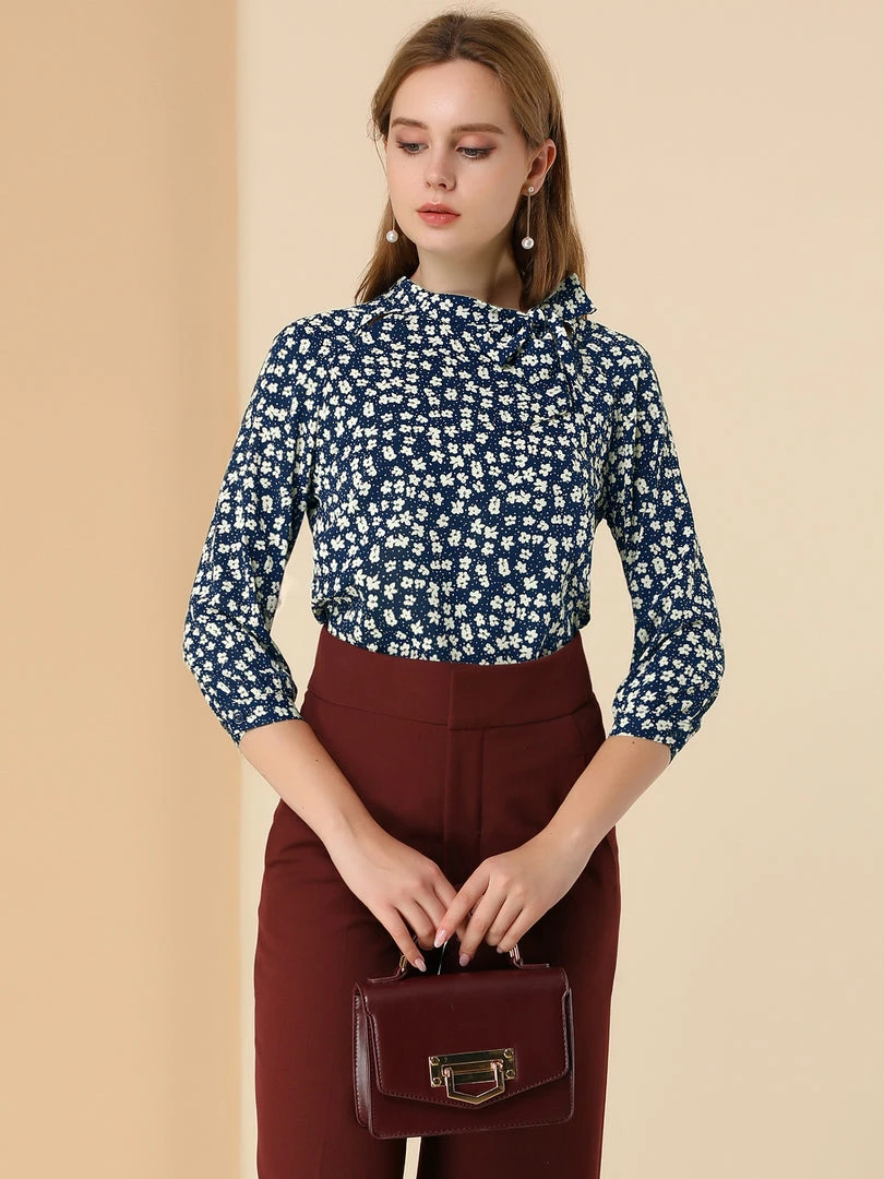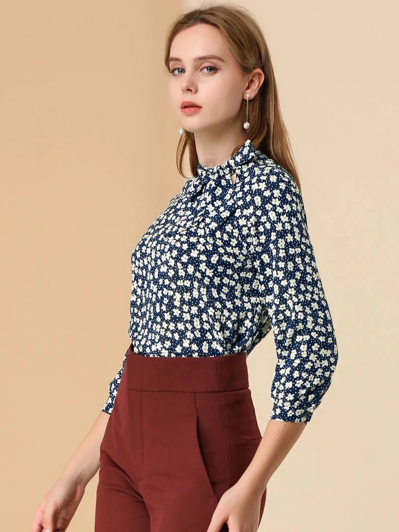 Allegra K Women’s Tie Neck Long Sleeve Floral Blouse