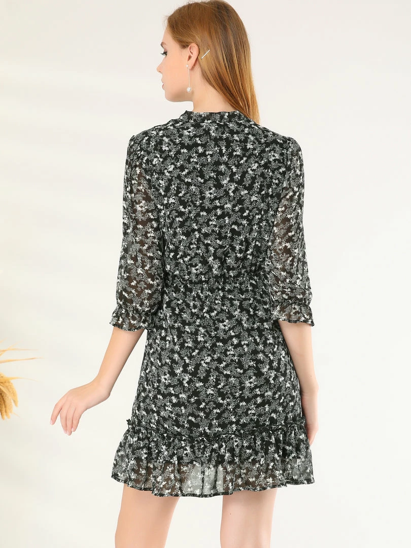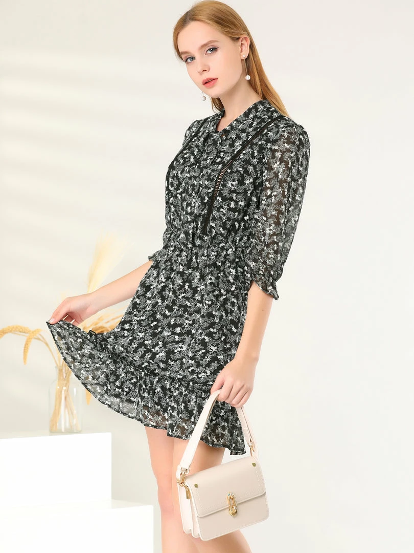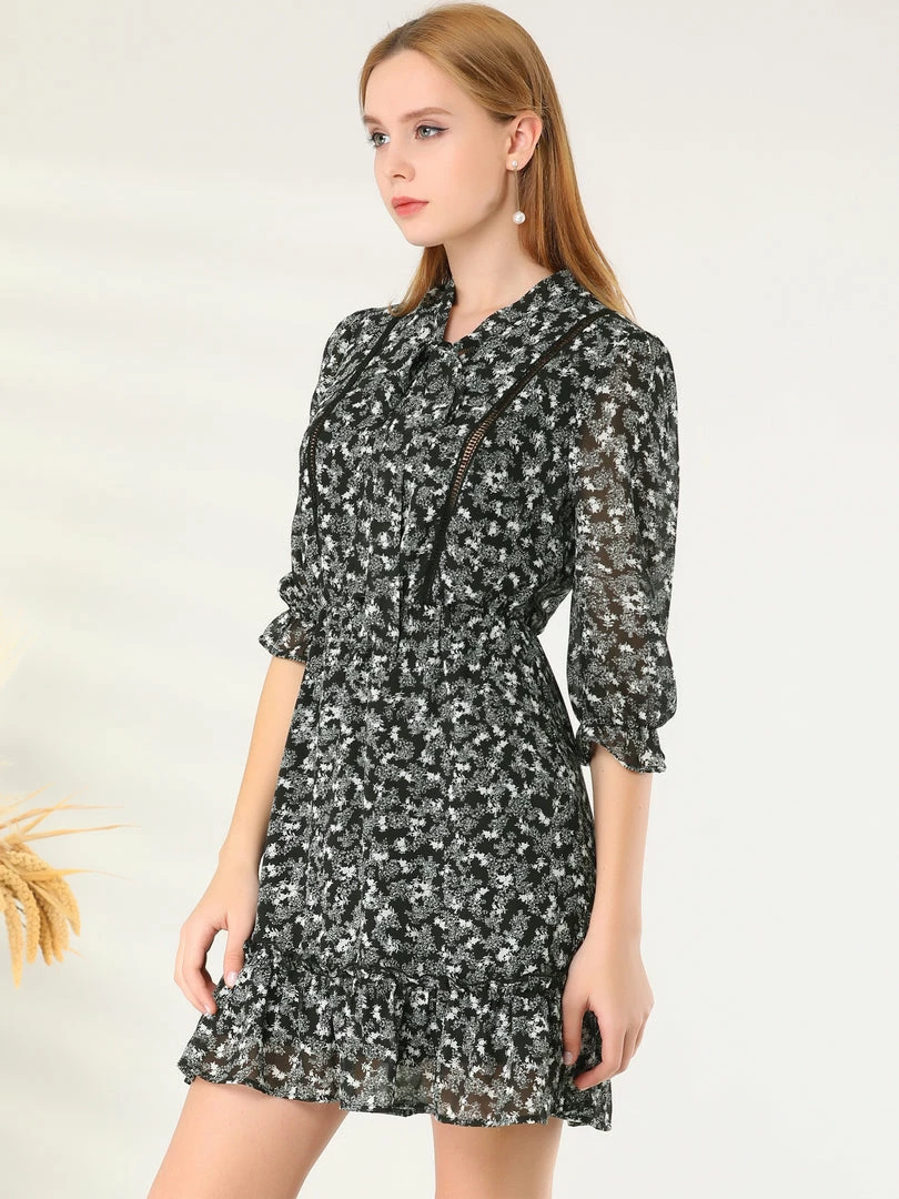 - Simple and delicate, this dress features floral prints, tie neck, ruffle hem, elastic waist, ruffle cuff, and puff sleeve.