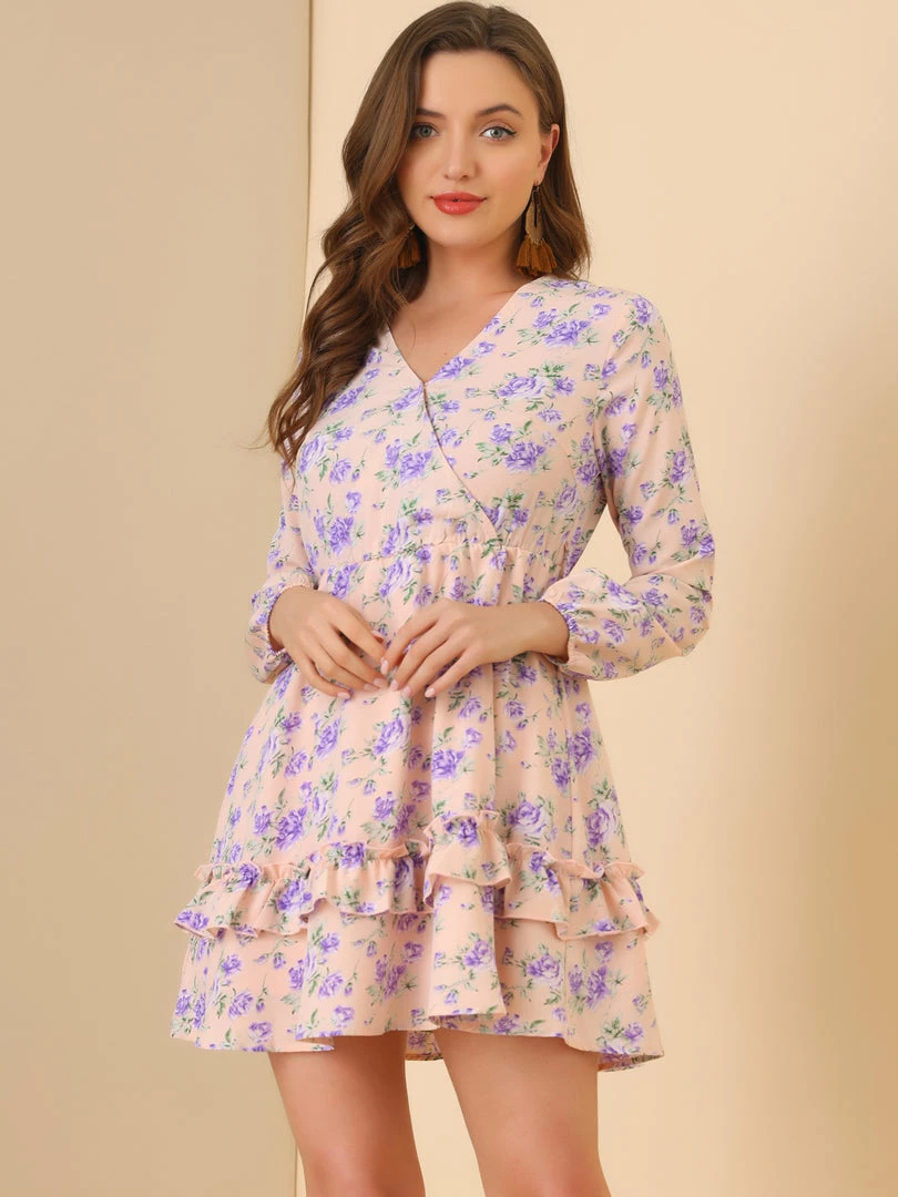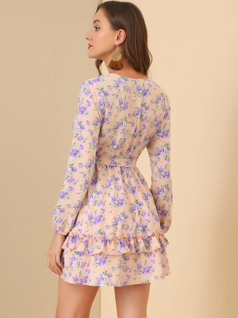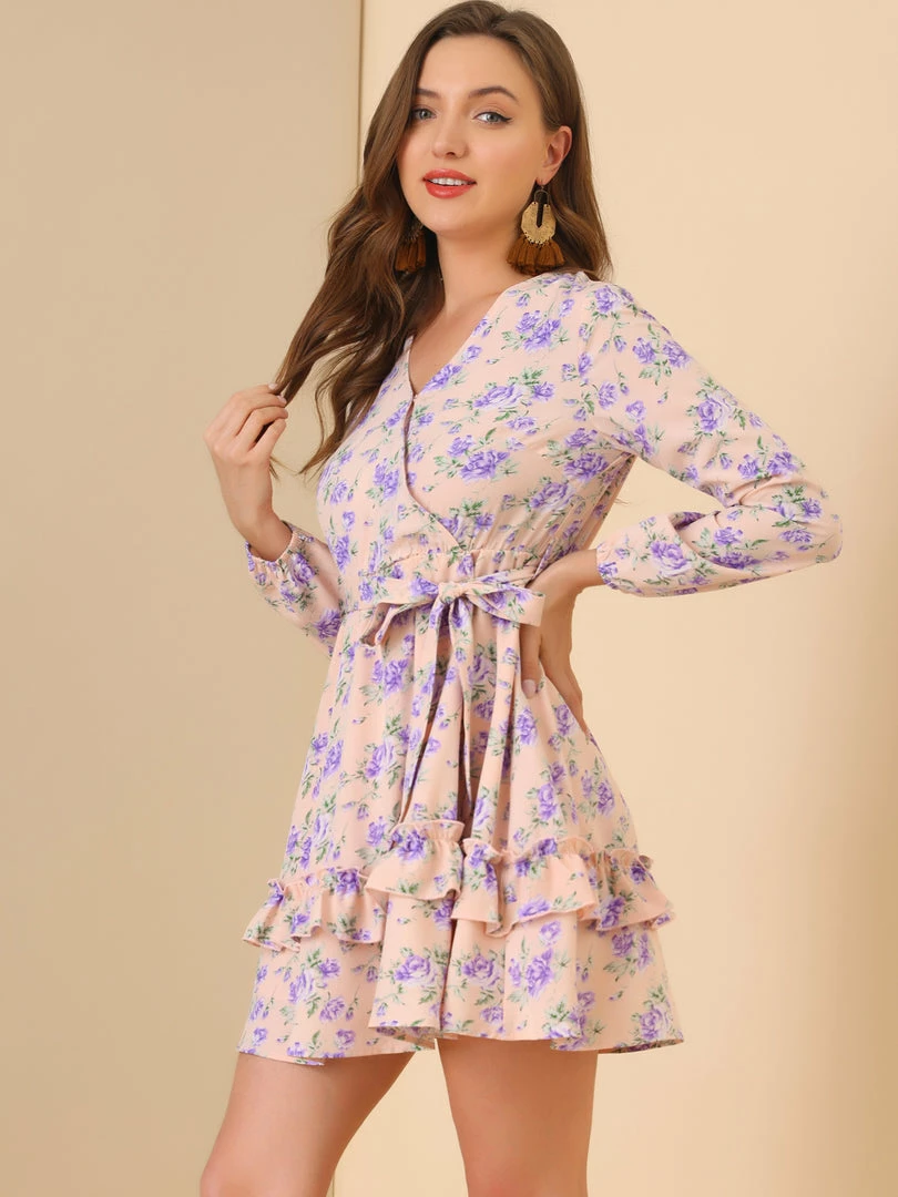 Allegra K Women’s Tiered Ruffle Hem 3/4 Sleeve Tie Waist Floral Dress