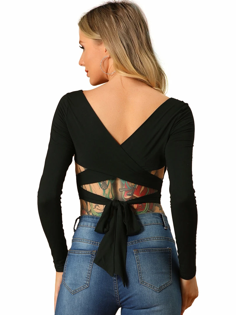 Allegra K Women’s U Neck Criss Cross Back Long Sleeve Slim Fit Bow Tie Waist Crop Tops