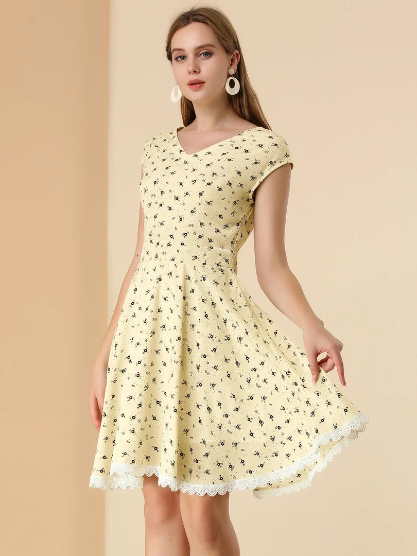 Allegra K Women’s V Neck Cap Sleeve Lace Trim Fit And Flare Floral Dress