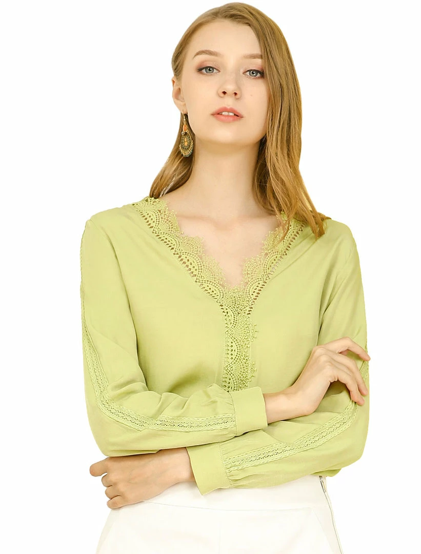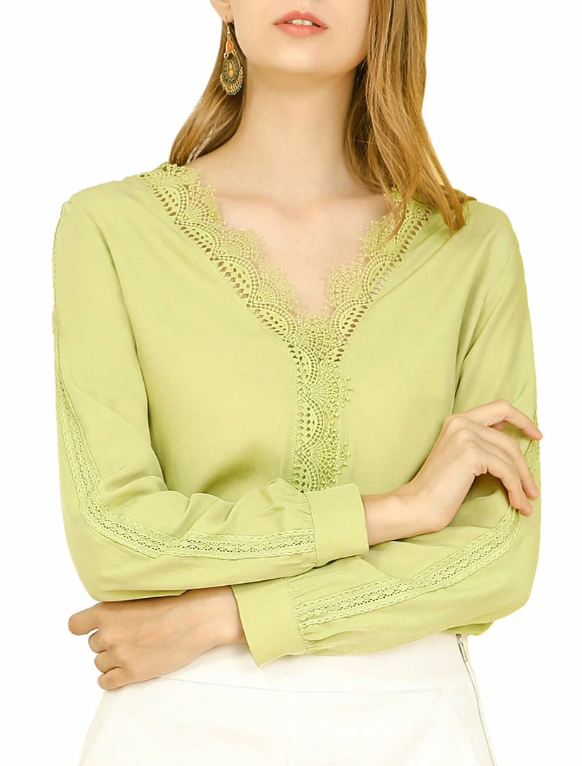 Allegra K Women’s V Neck Casual Blouse Top Sweet Patchwork Crochet Lace Shirt