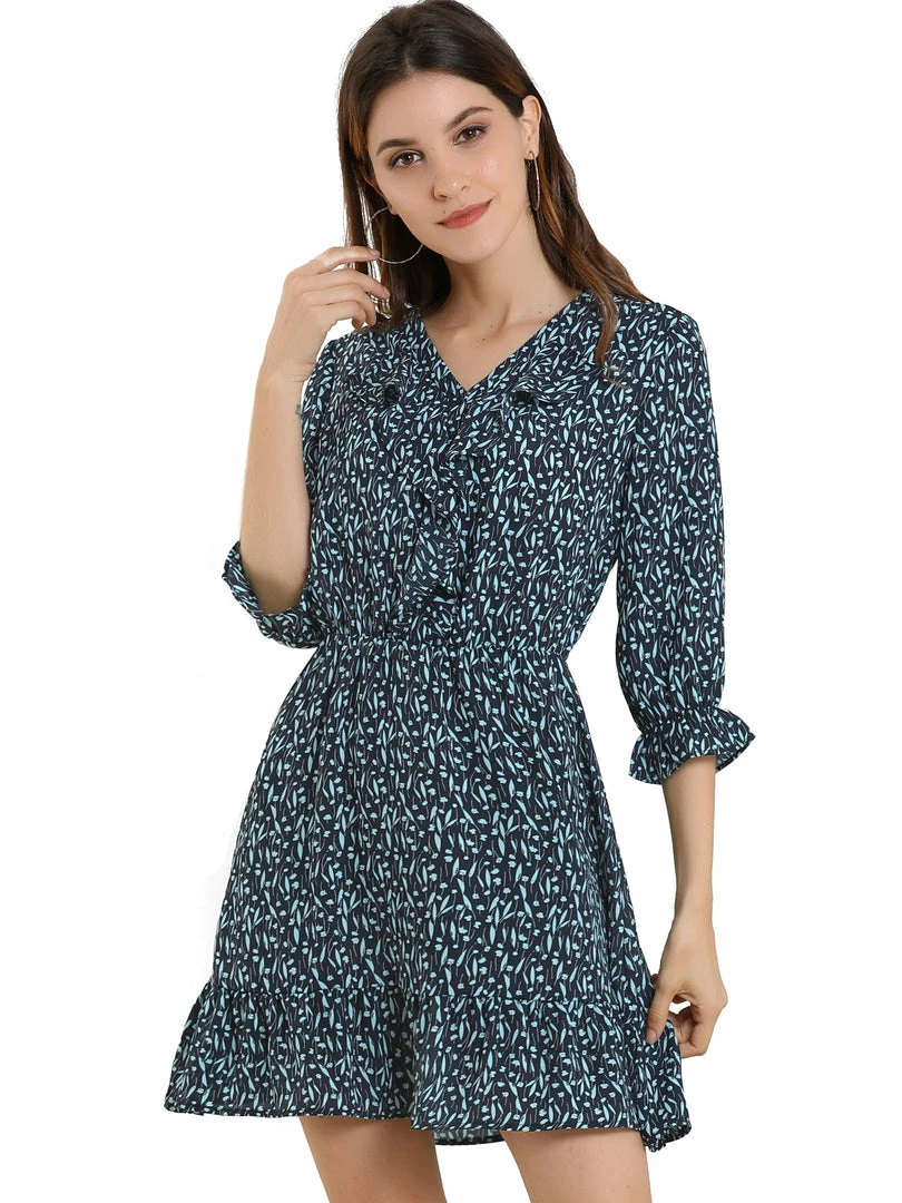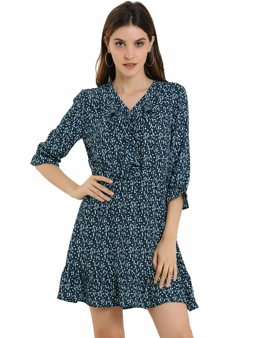 Allegra K Women’s V-Neck Casual Ruffle 3/4 Sleeve A-Line Floral Print Mini Dress