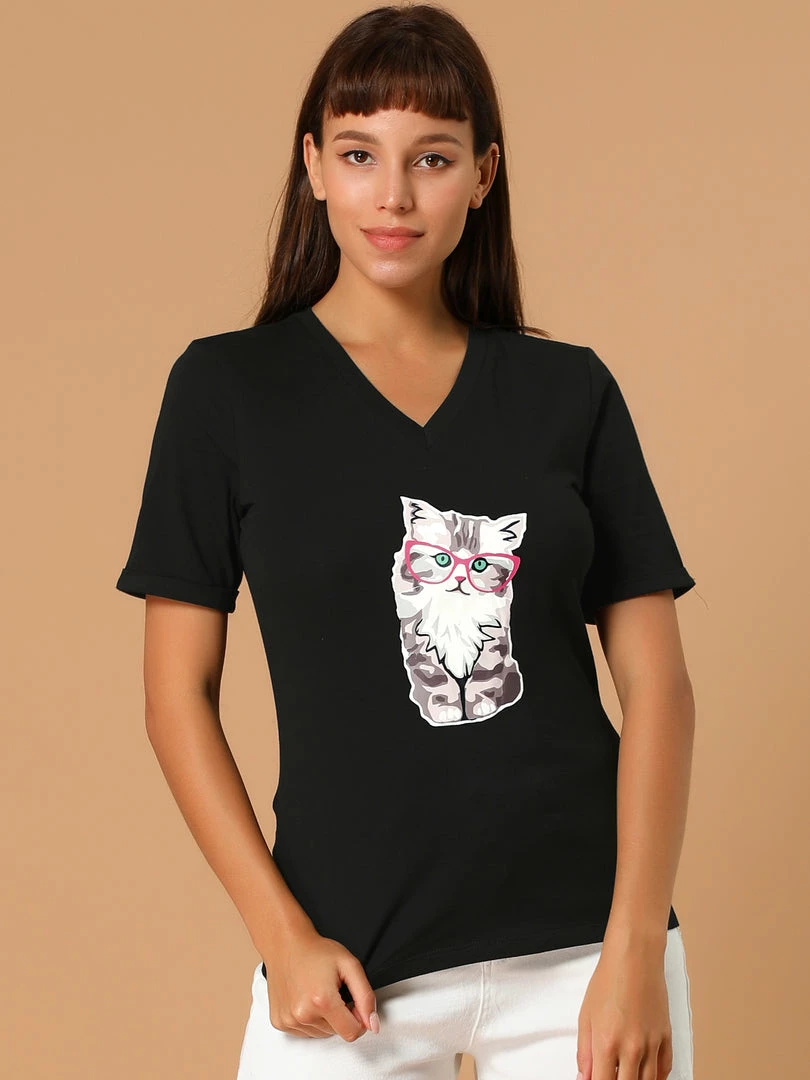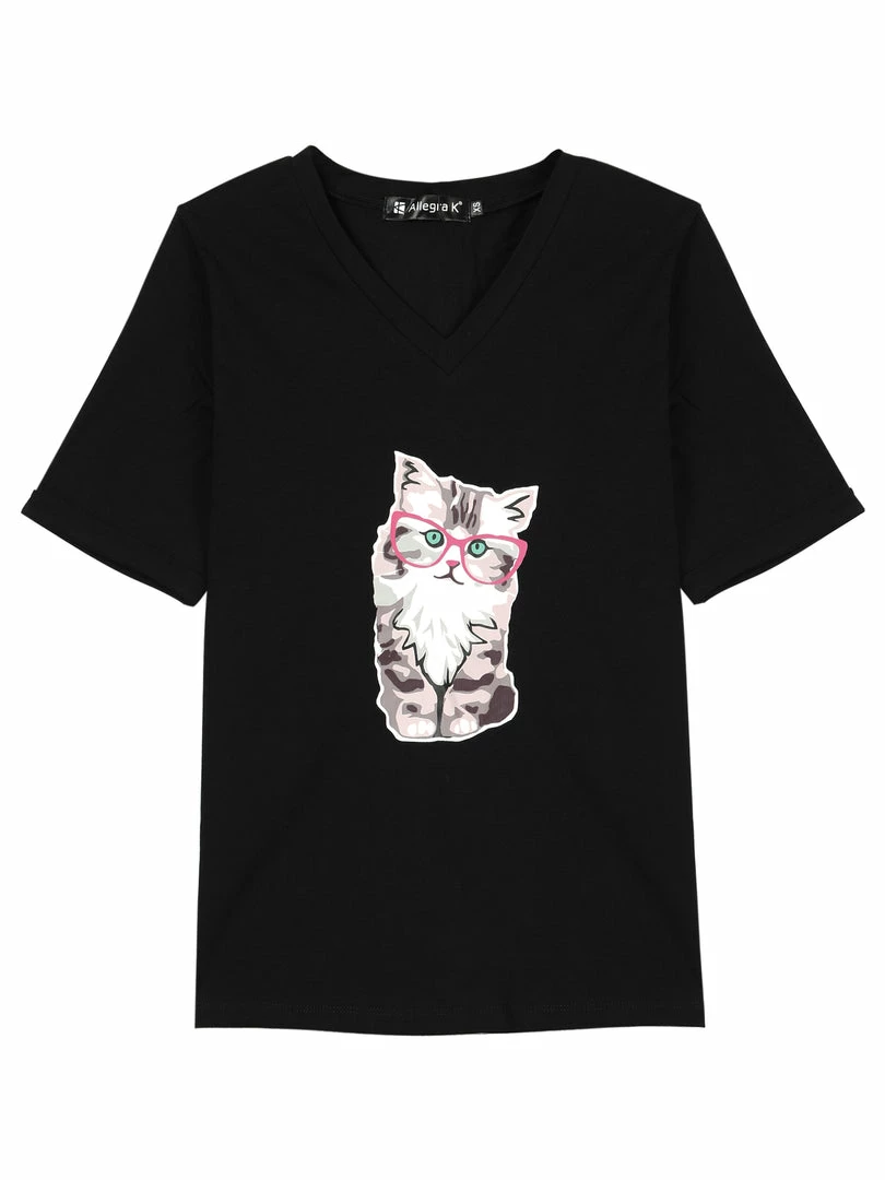 Allegra K Women’s V Neck Cotton Cat Print Short Sleeve T-Shirt