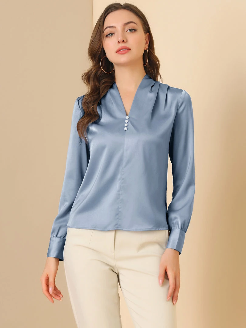 Allegra K Women’s V Neck Decor Button Pleated Solid Office Long Sleeve Shirt