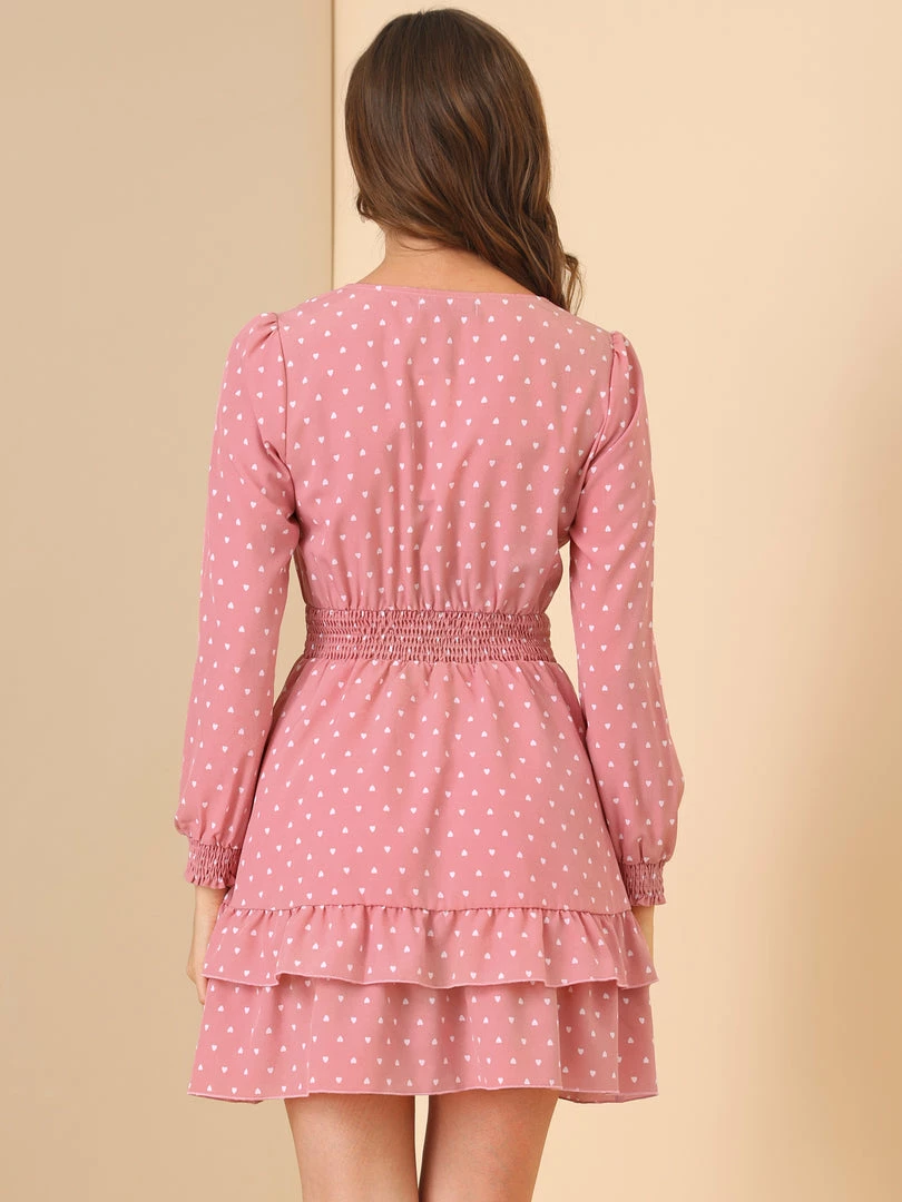 Allegra K Women’s V Neck Heart Print Dresses Smocked Waist Ruffle Hem Long Sleeve Dress