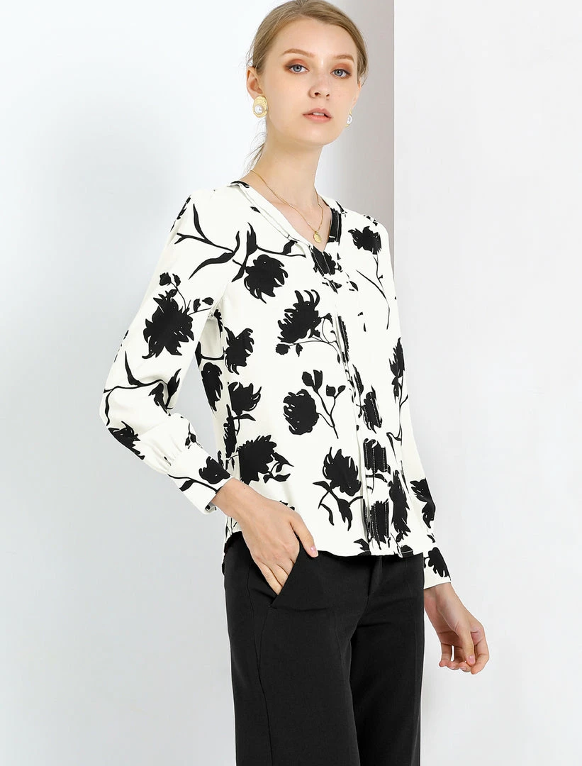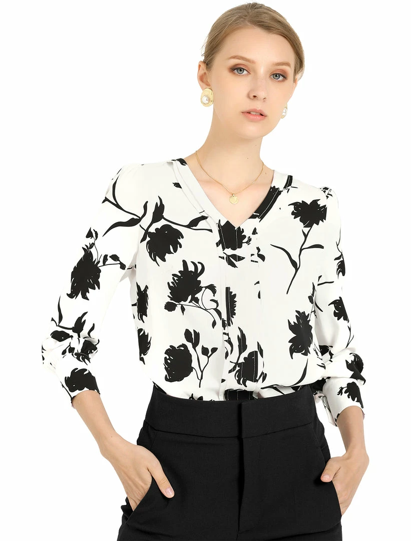 Allegra K Women’s V-Neck Long Sleeve Pleated Front Floral Printed Blouse