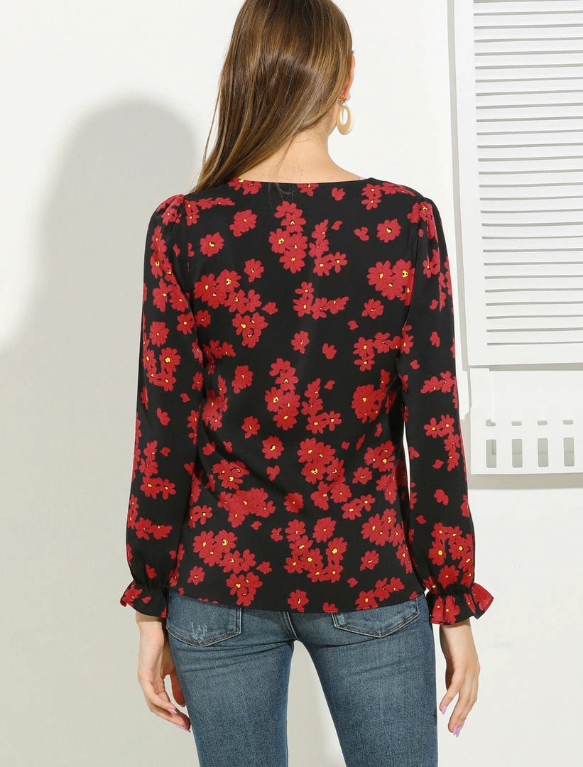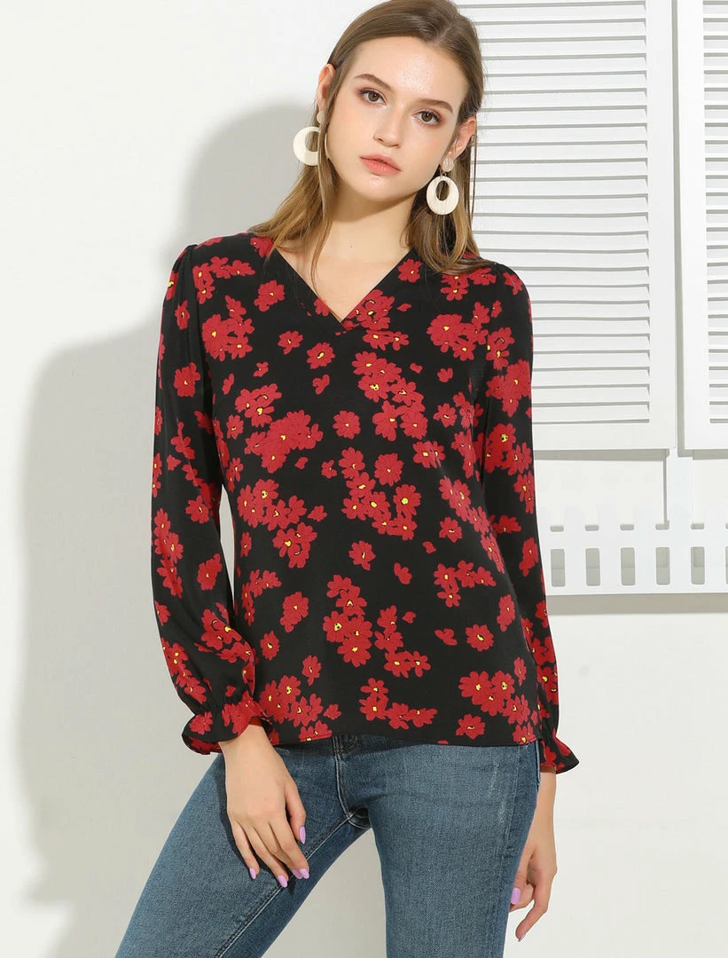 Allegra K Women’s V Neck Ruffled Long Sleeve Daisy Floral Print Blouse