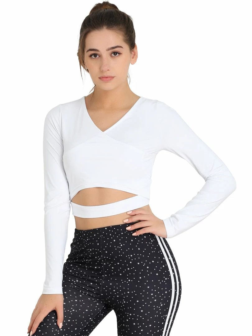 - Simple and useful, this yoga top features cross front, V neck, long sleeve, solid color, and slim fit.
