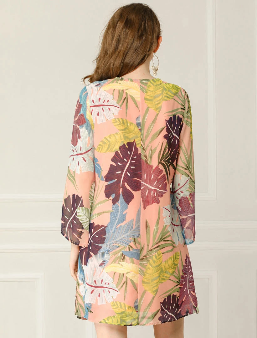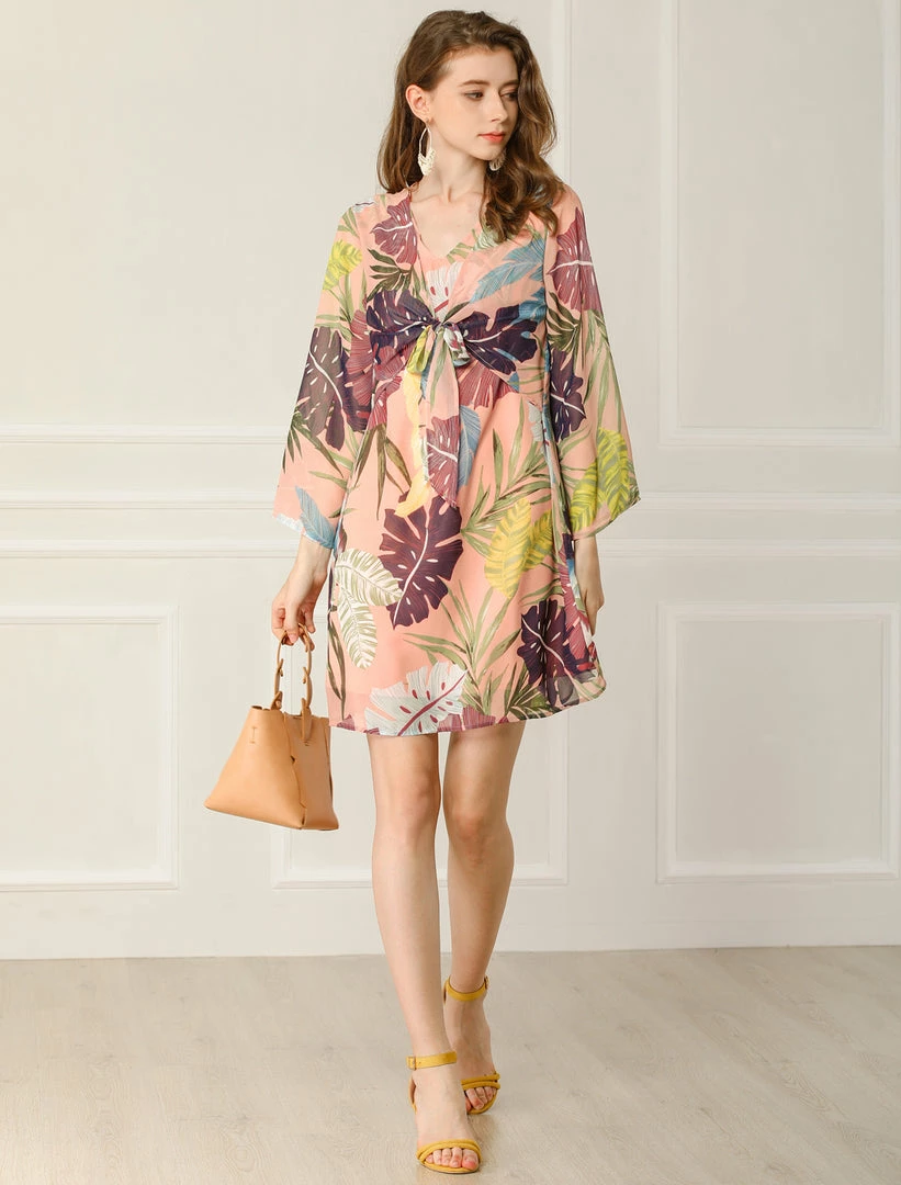 • Hawaiian leaves print set the mood for sunny-day strolling in this flowing dress styled with v neckline, tie front and flare sleeves.