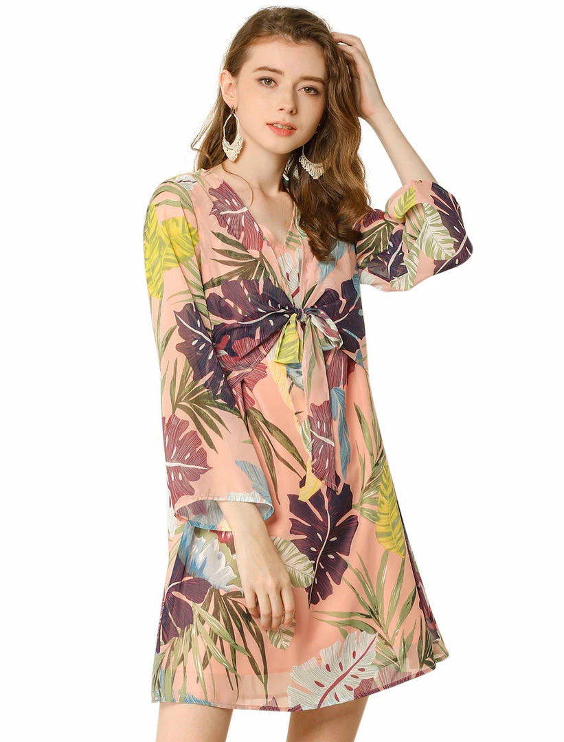 Allegra K Women’s V Neck Tie Front Tropical Floral Print Dress