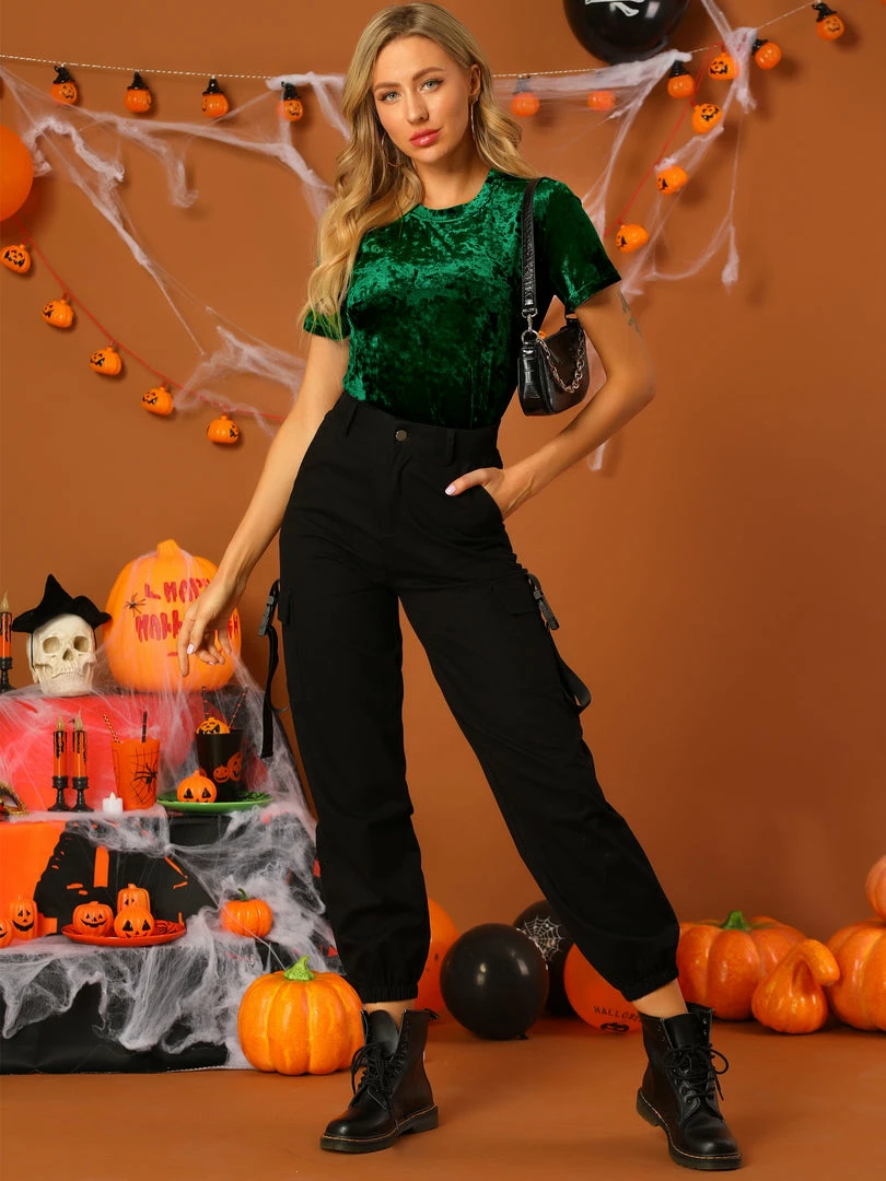 - This T-shirt styled in a crew neck and solid velvet fabric bring casual and chic to whatever outfit you’re putting together.