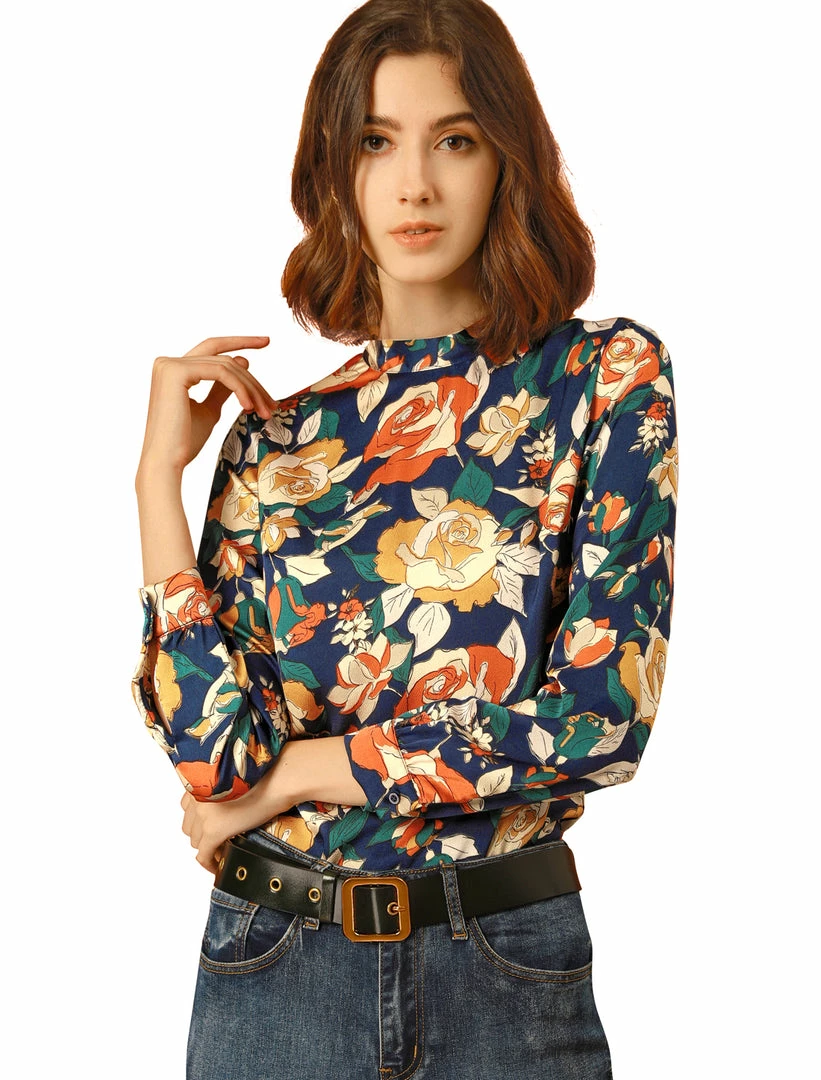 Allegra K Women’s Vintage Bow Tie Neck Button Back Long Sleeve Floral Blouse