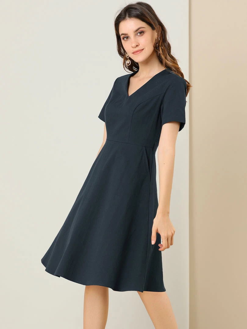 - Simple and delicate, it features bow tie waist, V neck, slash pocket, solid color, short sleeves, midi length, fit and flare, A line.