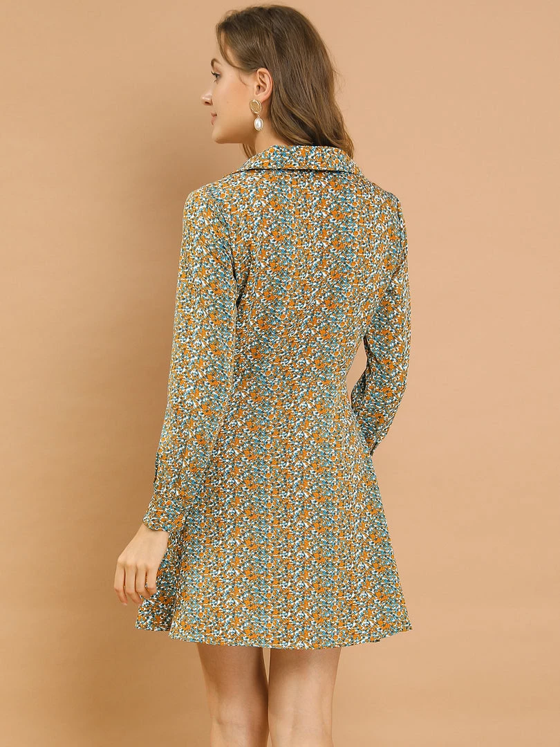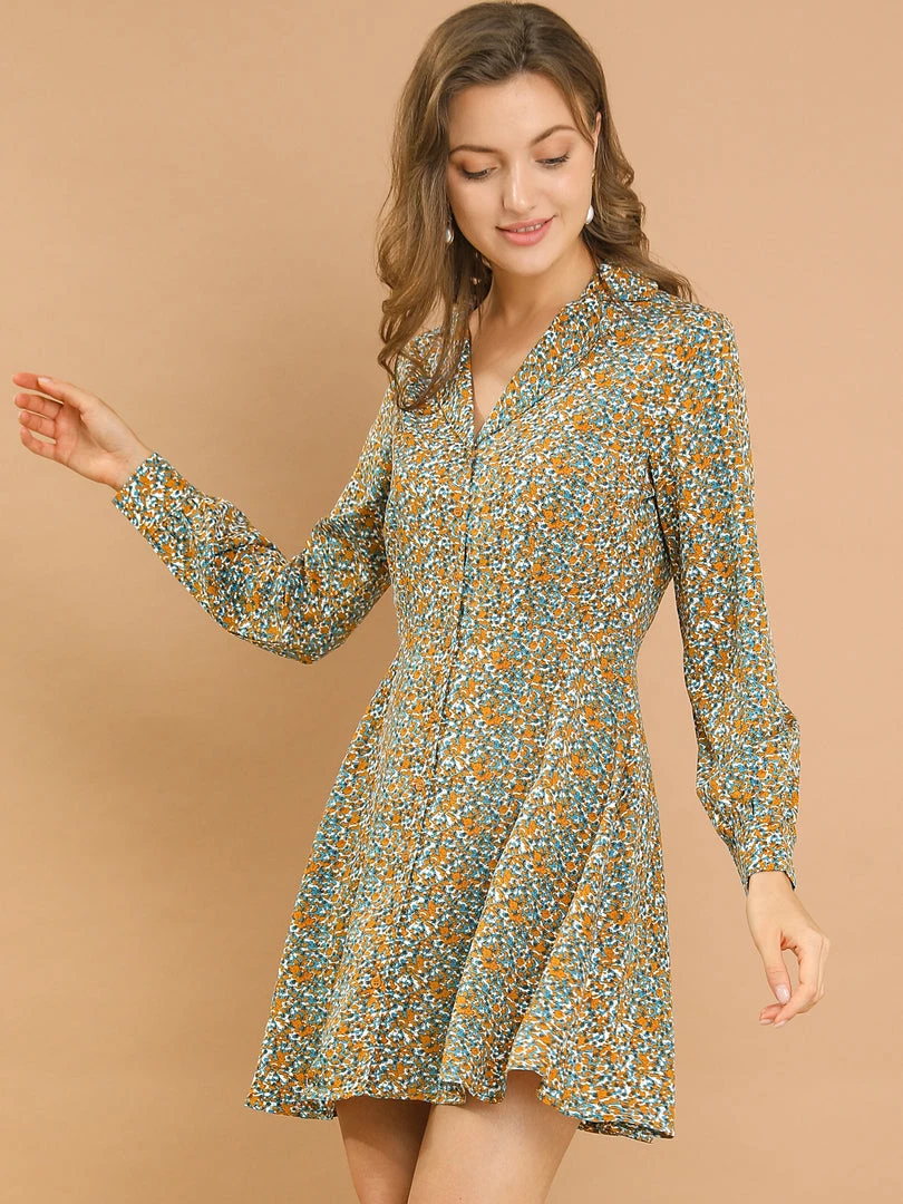 Allegra K Women’s Vintage Floral Print Camp Collar Dresses Long Sleeve Button Down Short Shirtdress