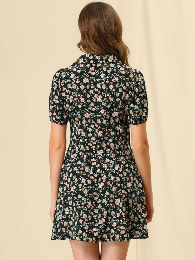 Allegra K Women’s Vintage Floral Short Sleeve Camp Collar Button Up A-Line Dress