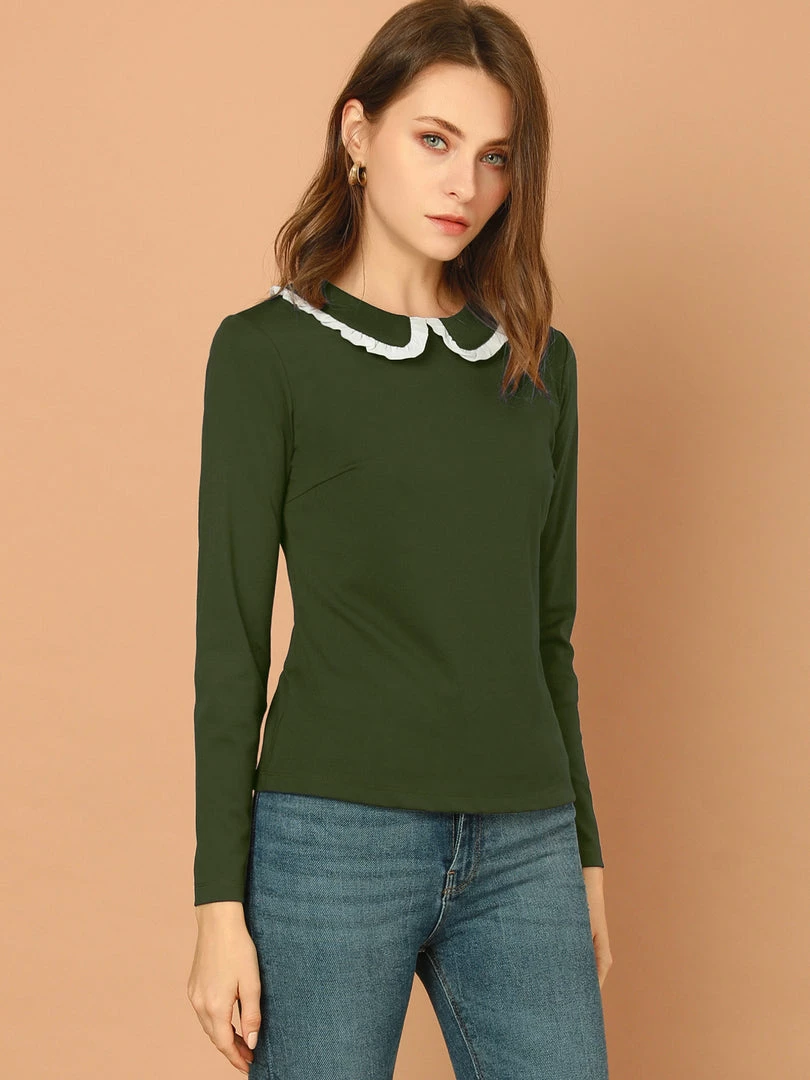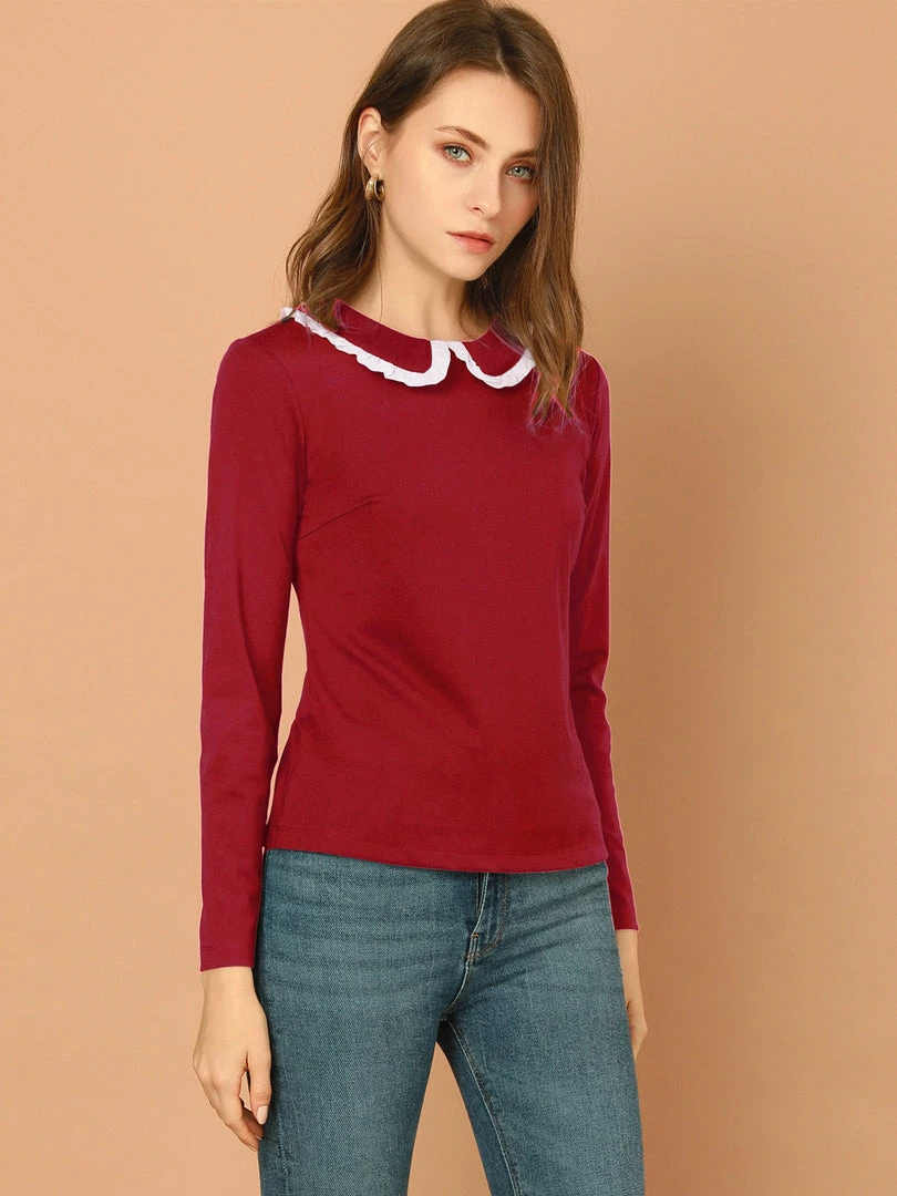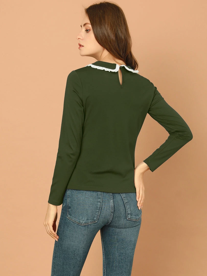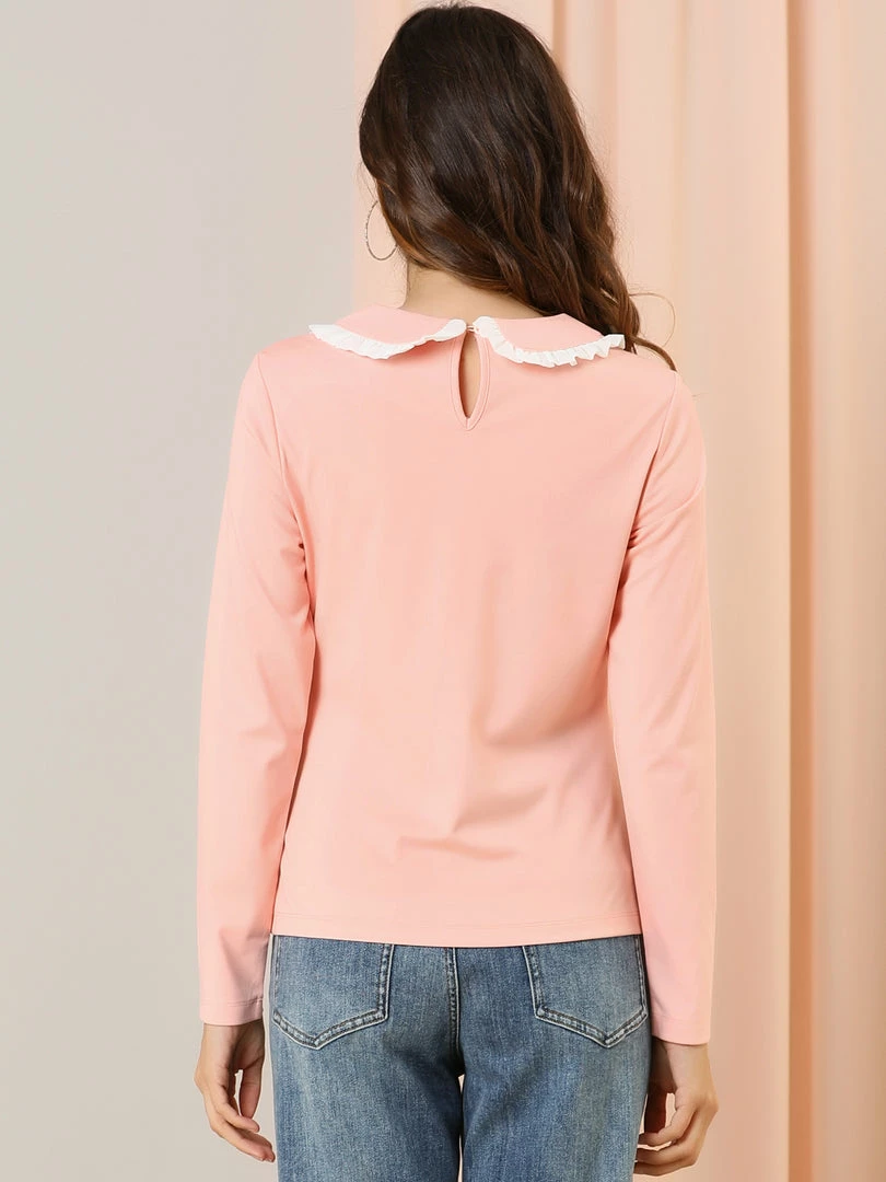 • A retro cute blouse with peter pan collar is spun from soft knit fabric in a gentle colors that add punch to your everyday wardrobe. • Featuring contrast ruffle trim, keyhole back design, this basic long sleeve top can be your perfect piece for this season.