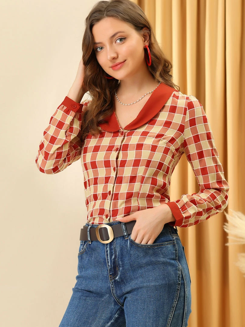 Women’s Vintage Casual Check Printed Contrast Collared Long Sleeve Button Down Plaid Shirt