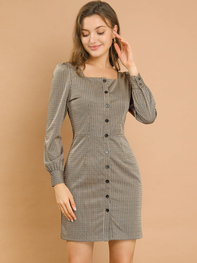 Allegra K Women’s Vintage Square Neck Button Up Puff Long Sleeve Plaid Houndstooth Printed Dress