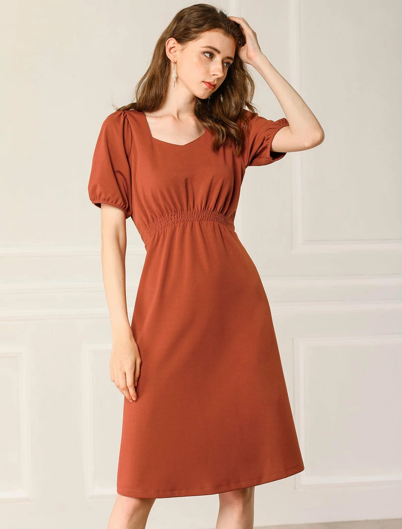 Allegra K Women’s Vintage Sweetheart Neck Smocked Front Short Puff Sleeve Dress