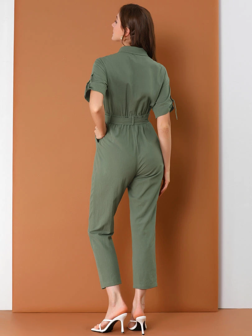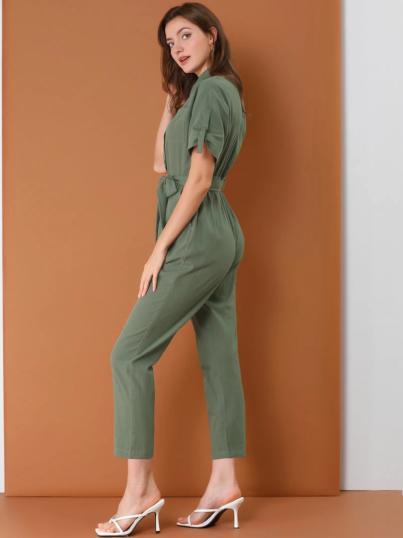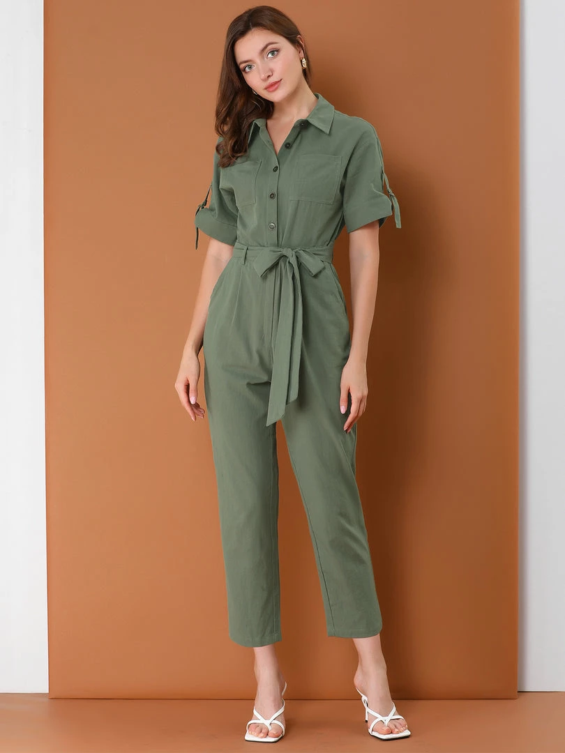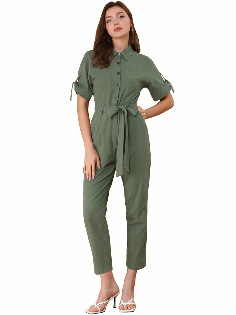 Allegra K Women’s Vintage Turndown Collar Button Up Tie Waist Jumpsuit With Pockets