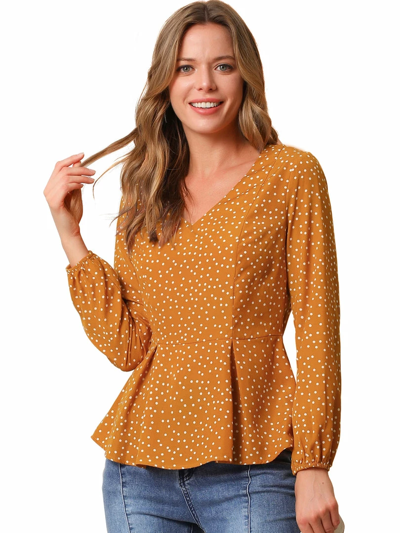 Allegra K Women’s Vintage V Neck Dots Pleated Long Sleeve Elegant Work Peplum Blouse Top