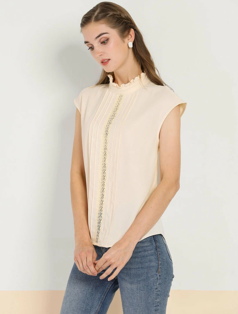 Allegra K Women’s Work Casual Crochet Insert Pleated Plain Cap Sleeve Blouse