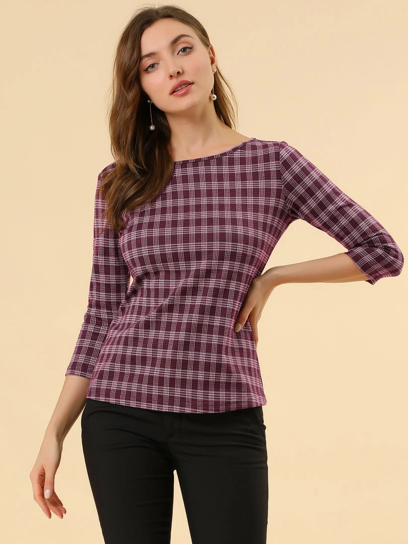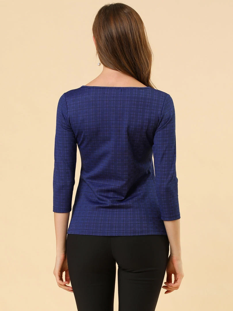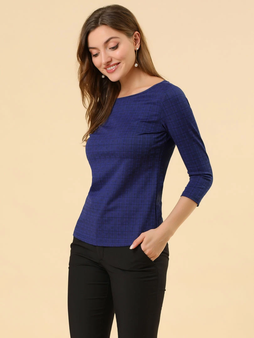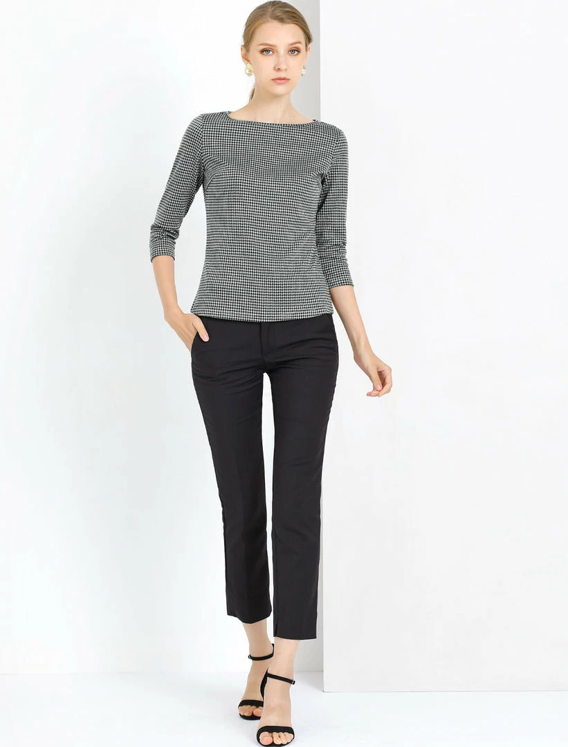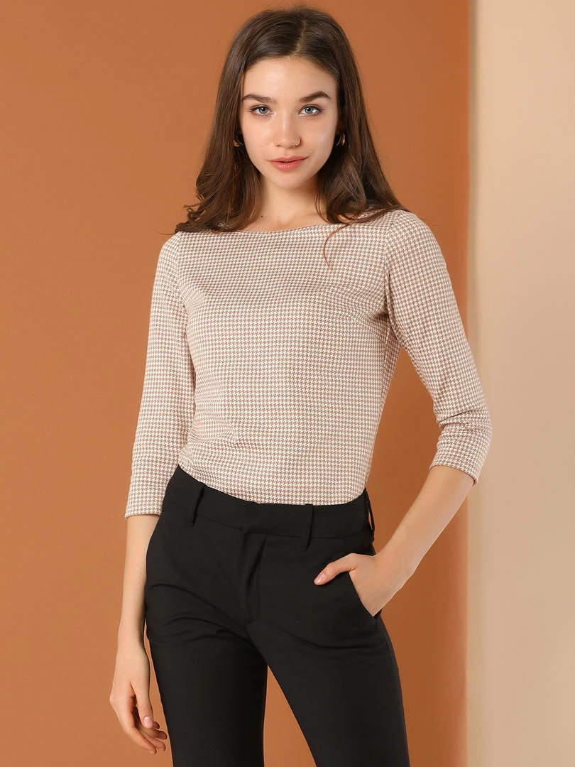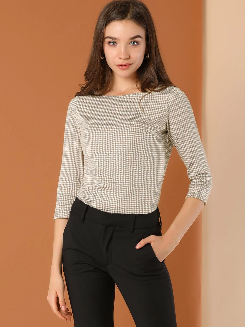 Allegra K Women’s Work Office 3/4 Sleeve Boat Neck Houndstooth Top Blouse