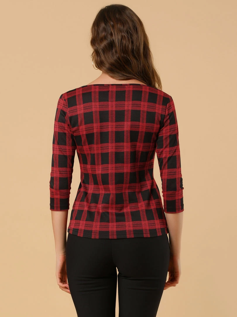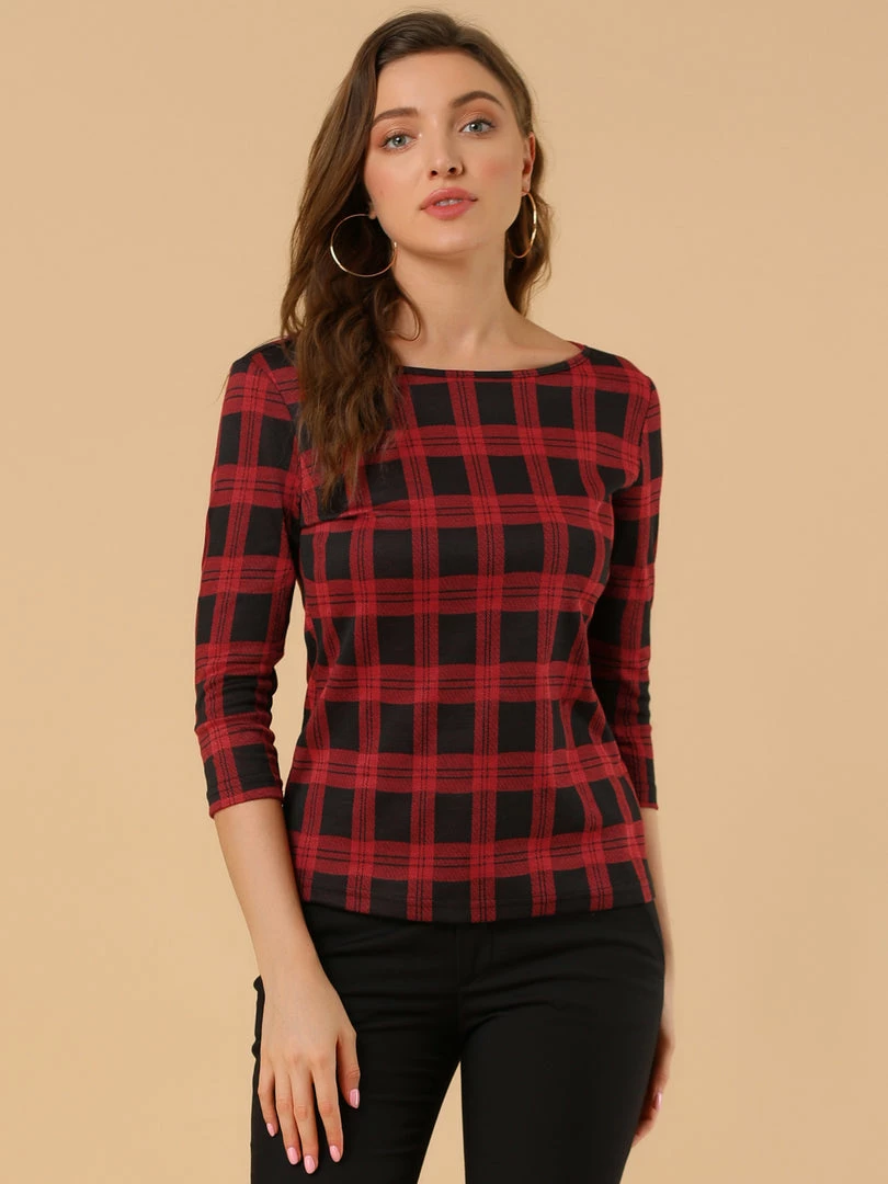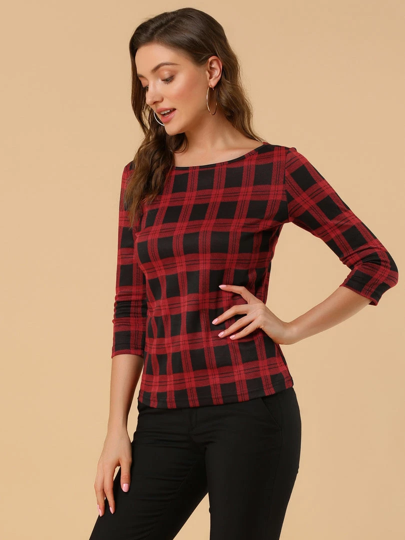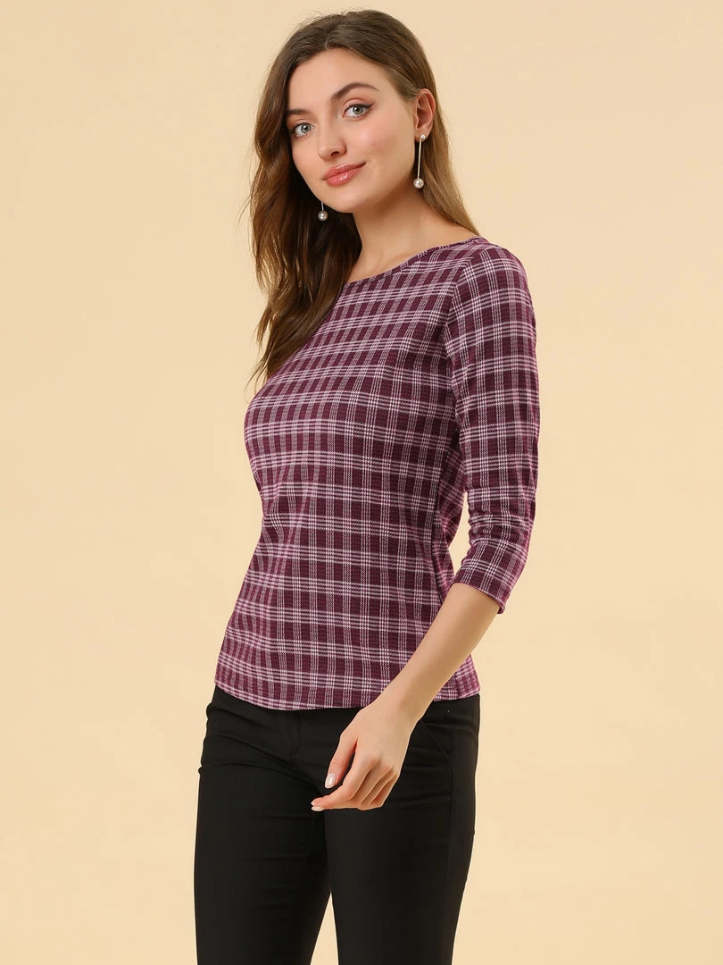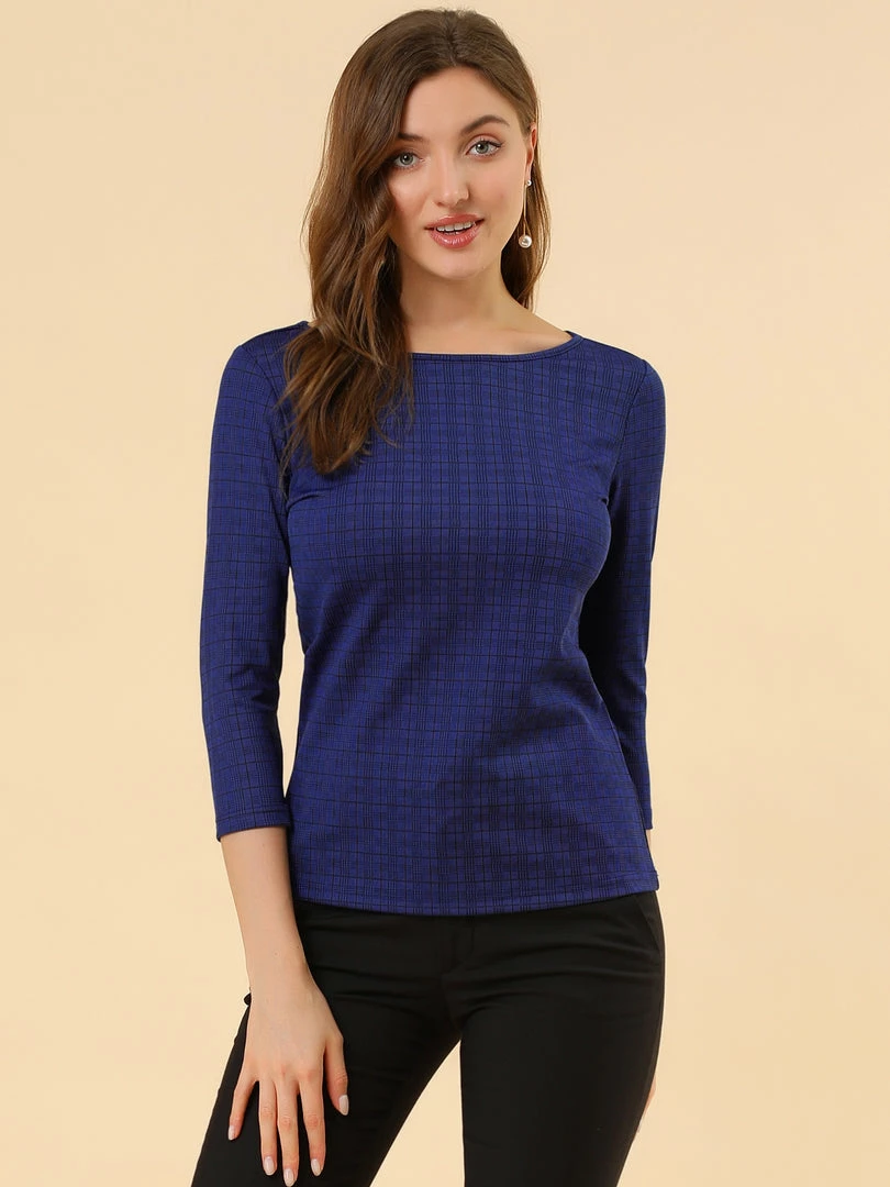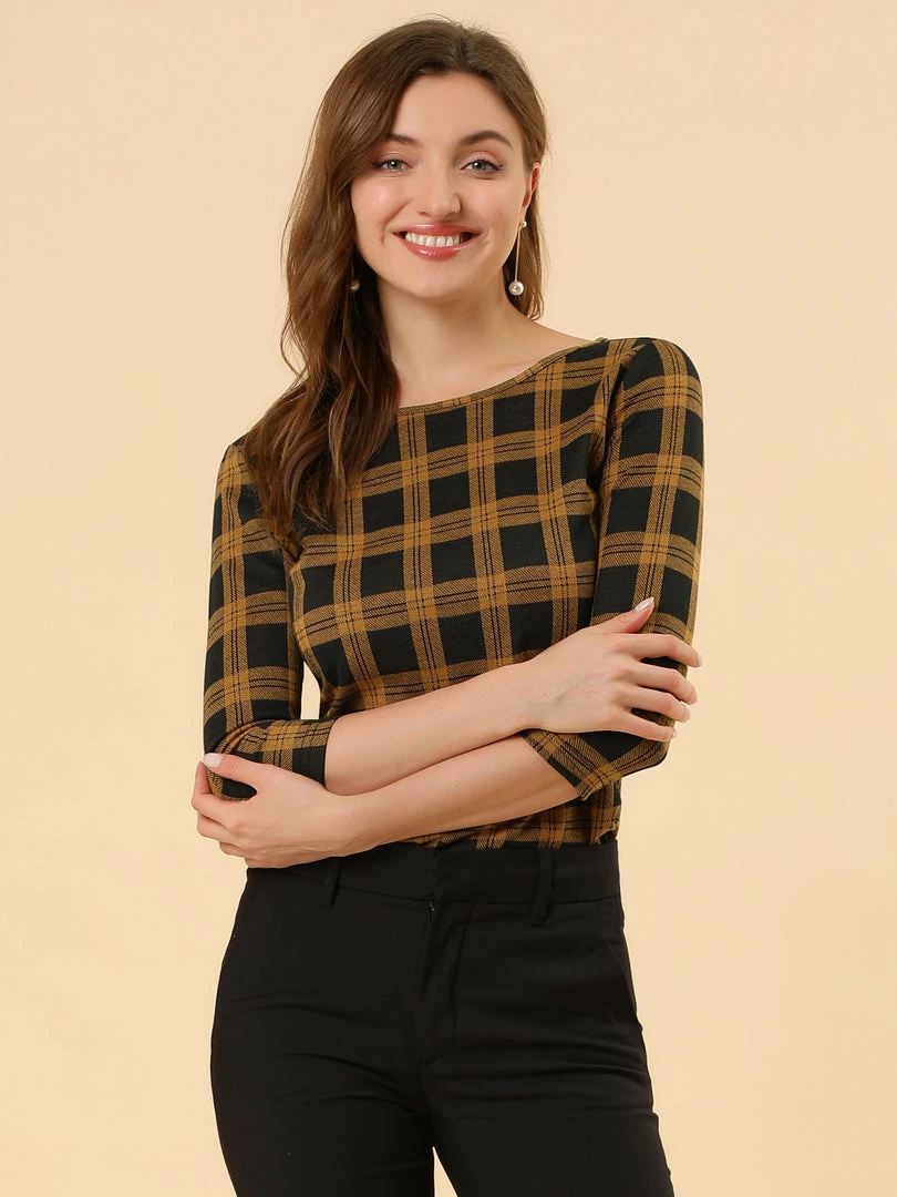 Allegra K Women’s Work Office 3/4 Sleeve Boat Neck Houndstooth Top Blouse