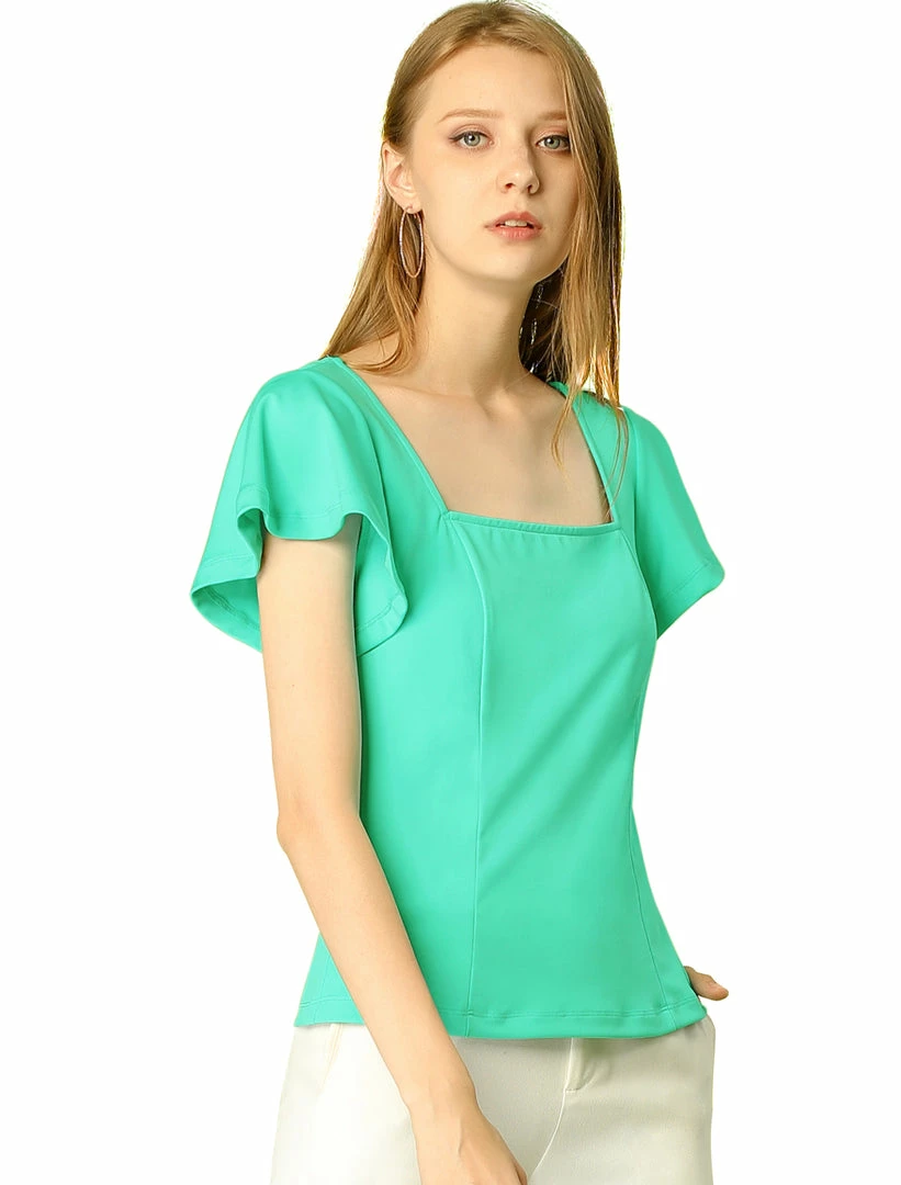 Allegra K Women’s Work Office Square Neck Flutter Sleeve Solid Blouse Top