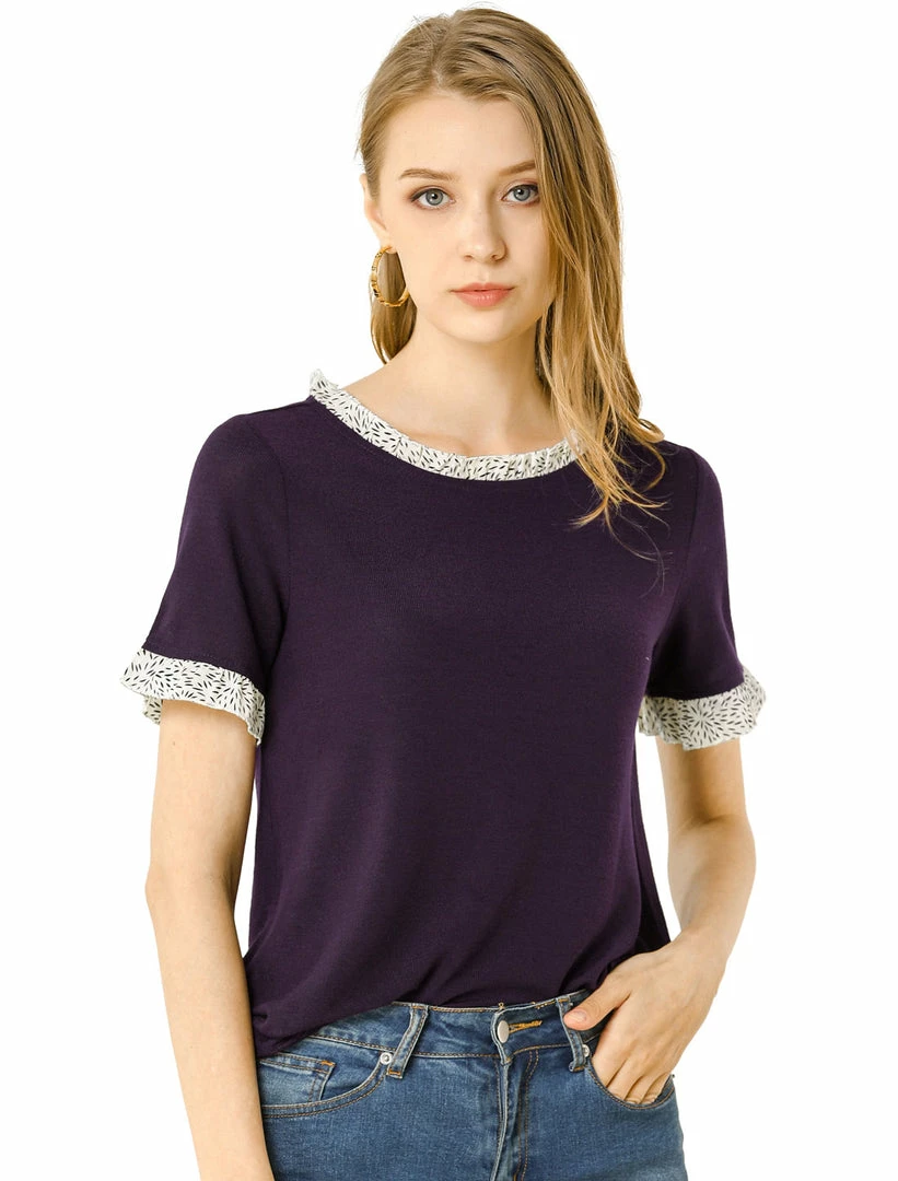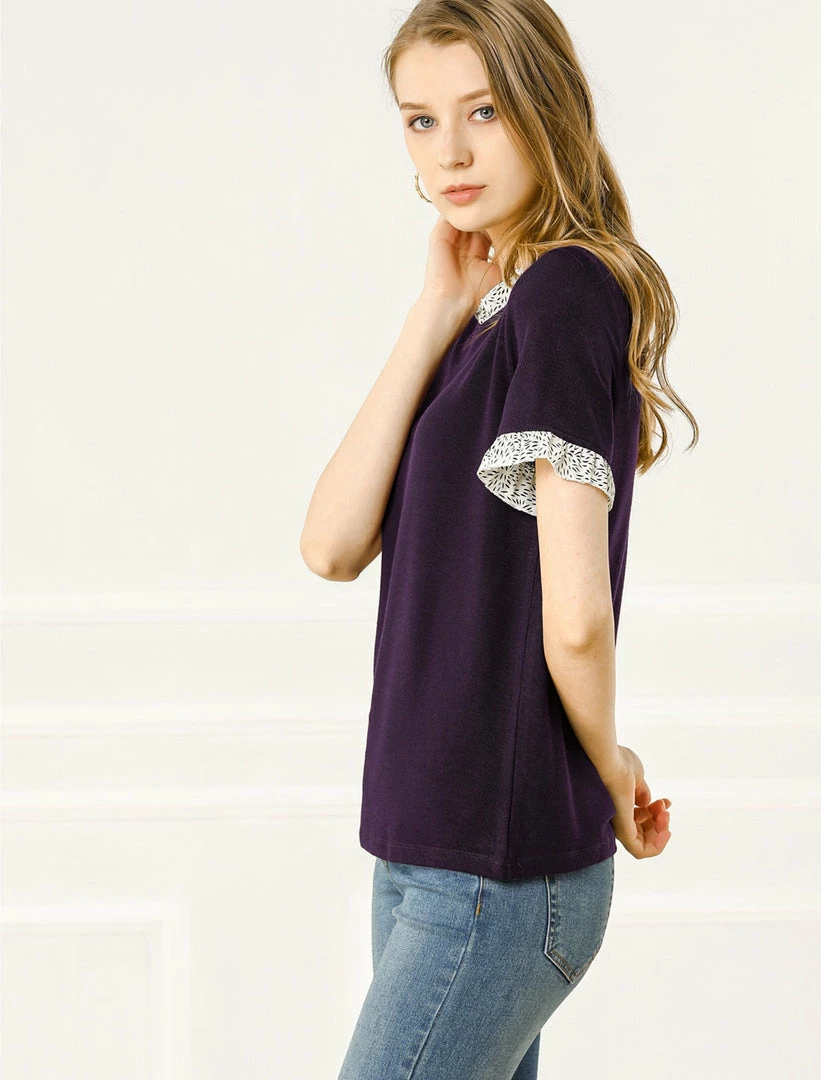 Allegra K Women’s Work Ruffled Trim Cuff Round Neck Solid Top Knit T-Shirt