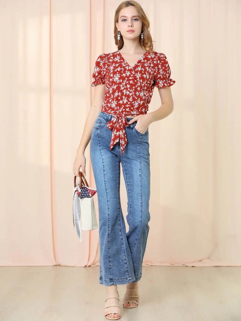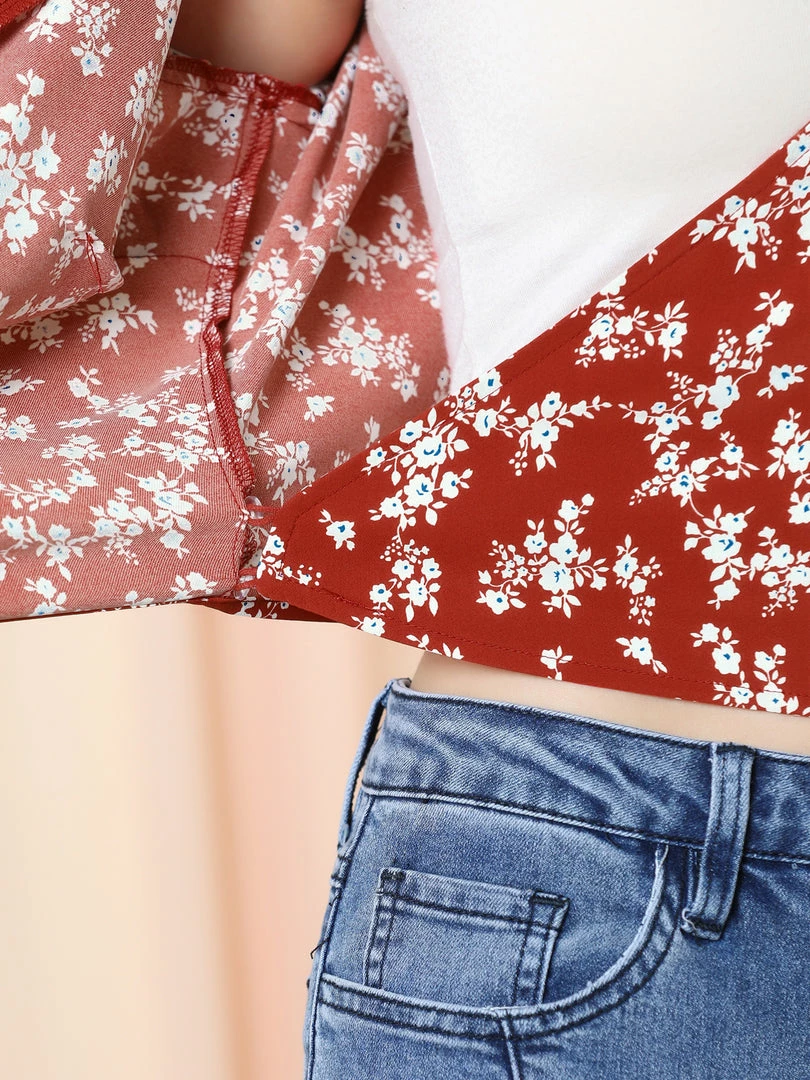 Allegra K Women’s Wrap Crop Top Ruffle Short Sleeve V Neck Tie Waist Floral Blouse