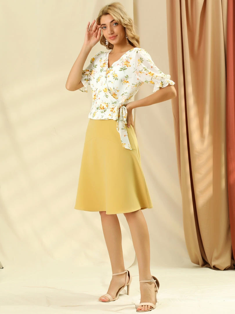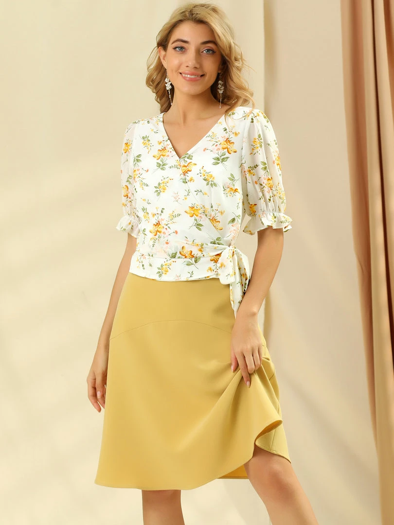 Allegra K Women’s Wrap Peplum Top Tie Waist Ruffle Floral V Neck Belted Blouse