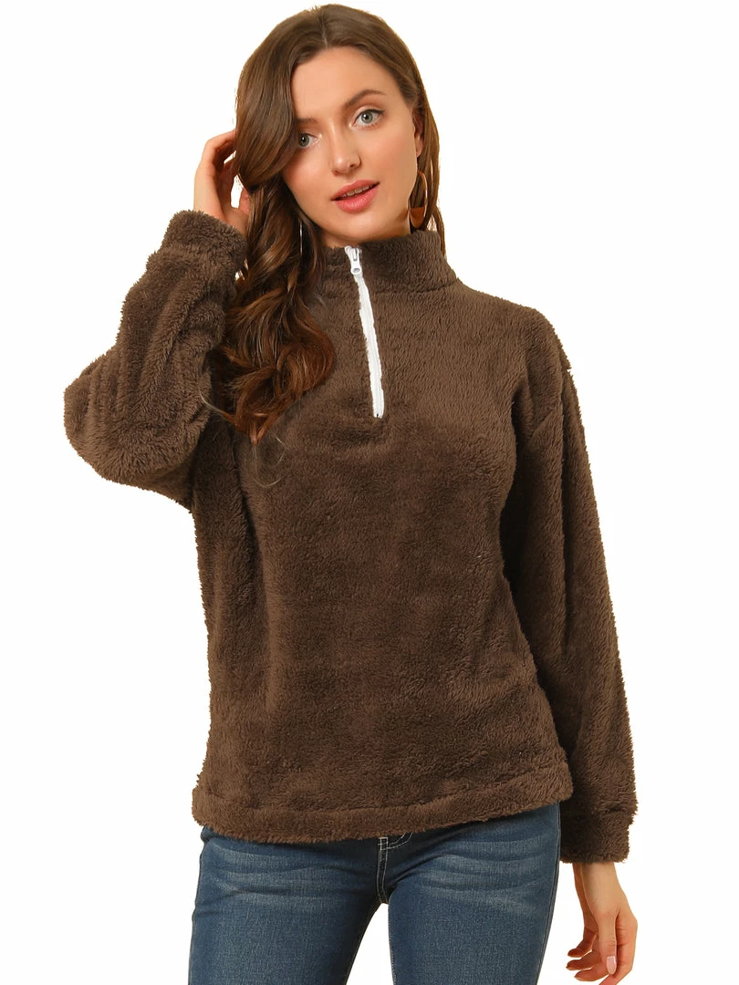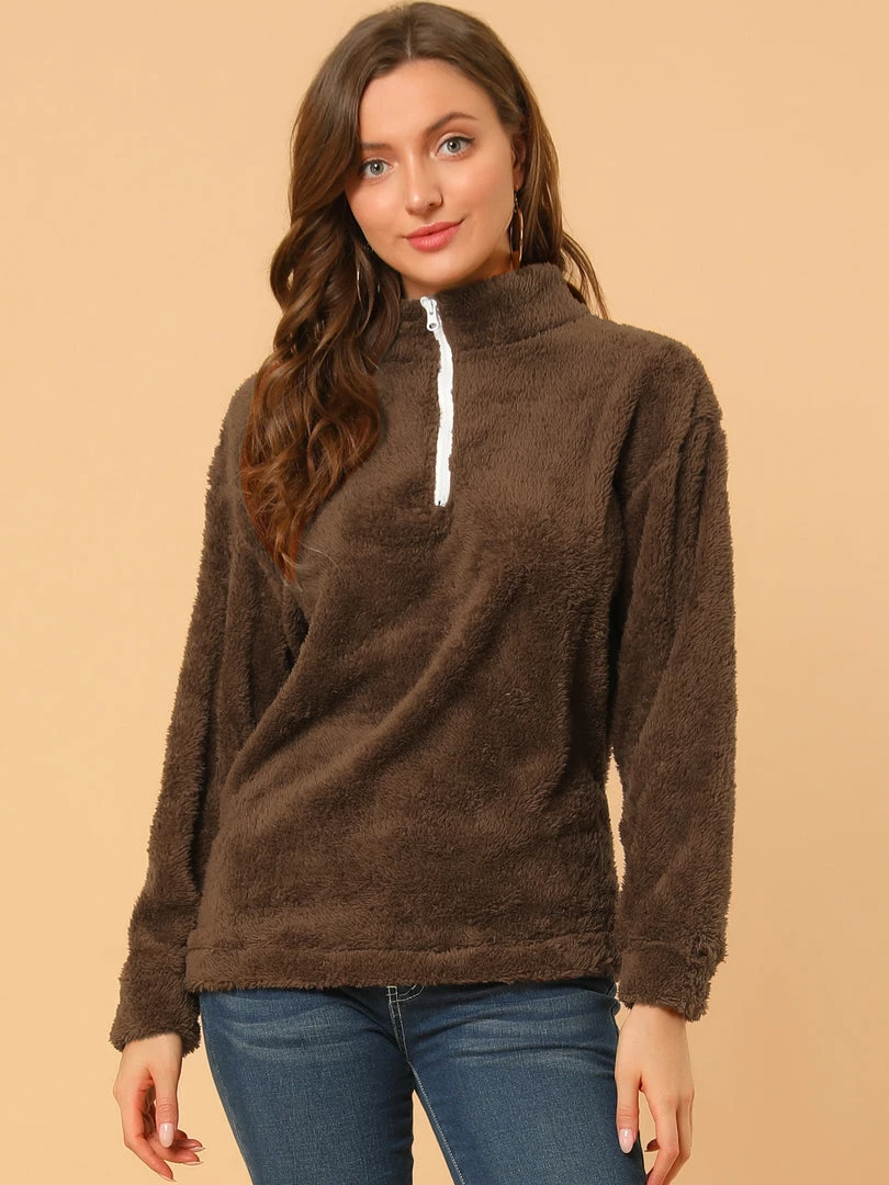 - Stay ready for cozy season in this fuzzy pullover featuring a flattering Turn Down/Stand Collar.
