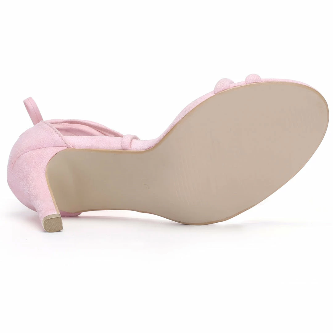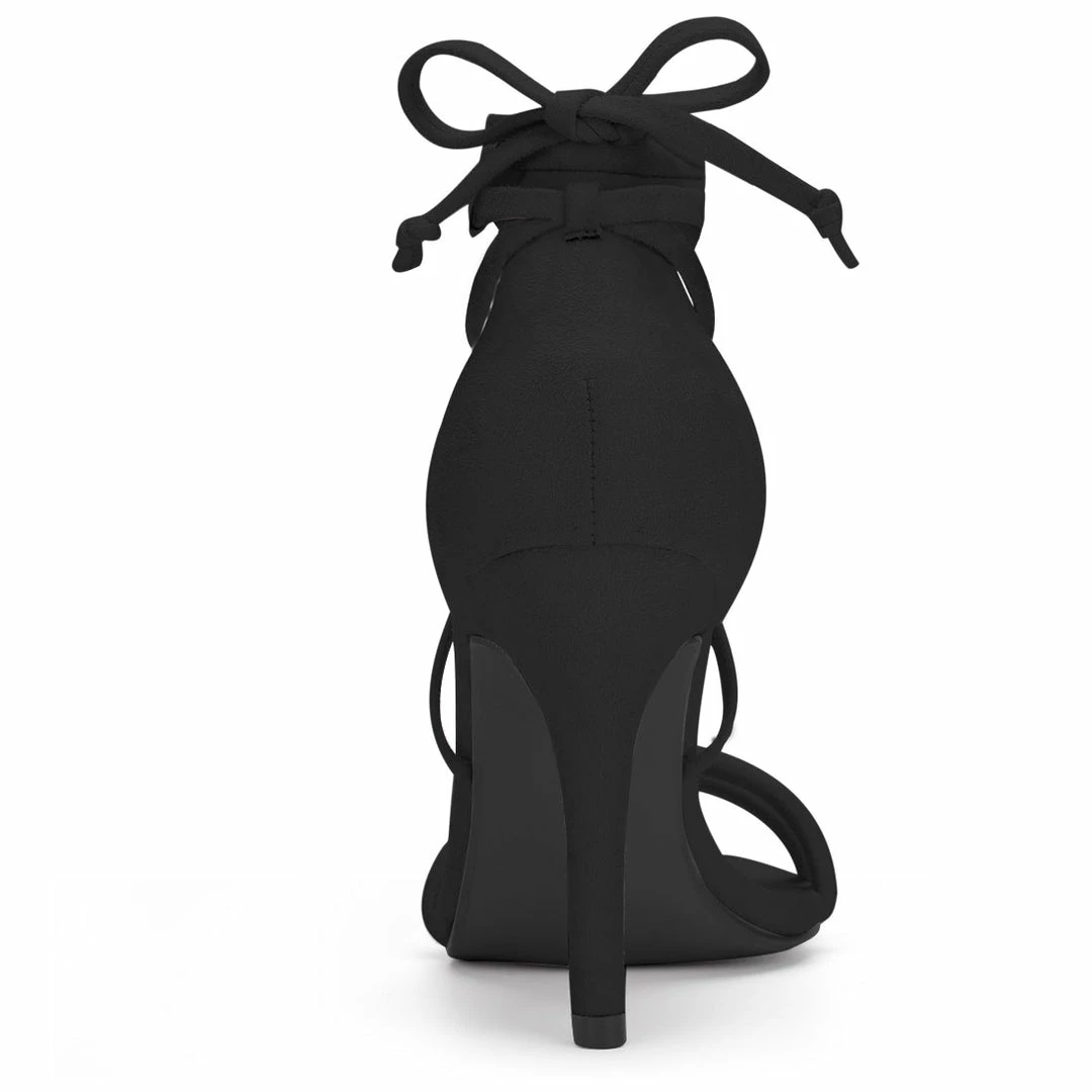A towering stiletto lifts a dress sandal that climbs even higher with wraparound laces.